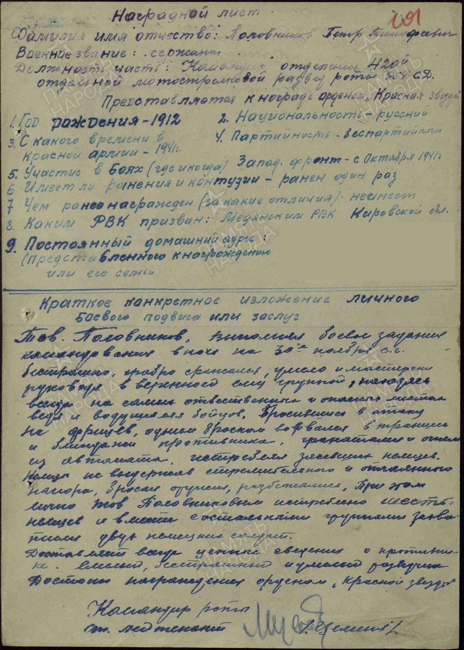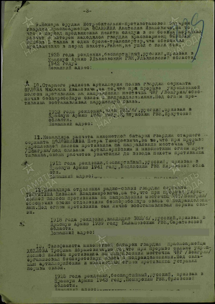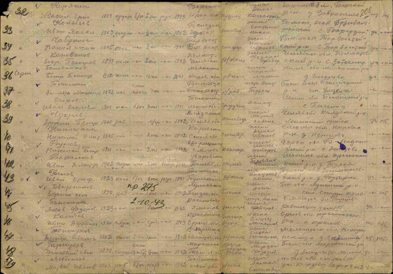 Военно-пересыльный пункт: 1 зсд Выбытие из воинской части: 02.10.1943 (Половников Петр Тамоф.)