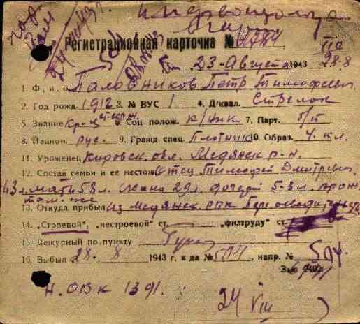 Военно-пересыльный пункт: Кировский ВПП Выбытие из воинской части: 28.08.1943