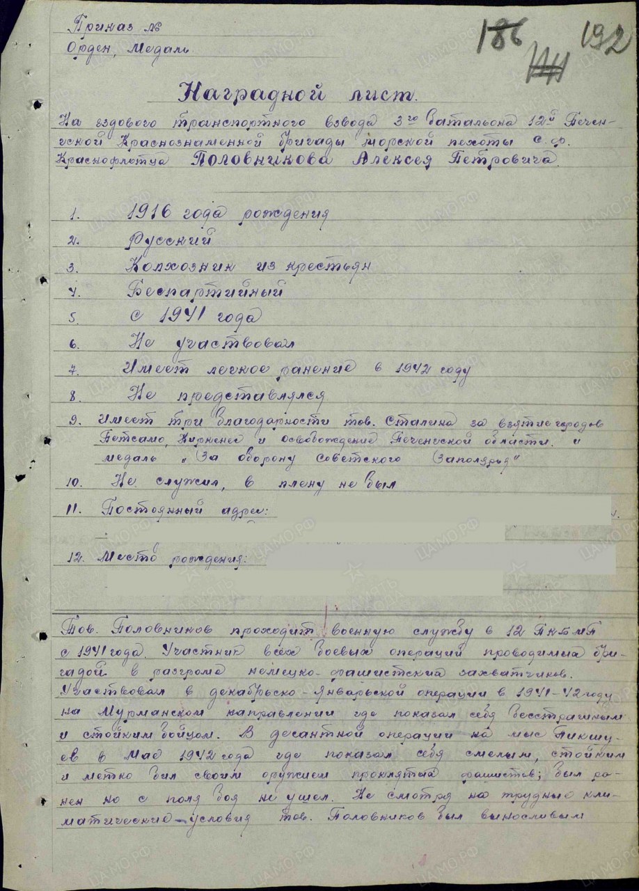 1941 год. Он уже участник военных действий на Кольском полуострове - обороняет Советское Заполярье. Алексей Петрович участвовал в Петсамо-Киркенесской наступательной операции в период с 07 по 27 октября 1944 года, служил в особой, секретной части, о которой никогда не рассказывал.