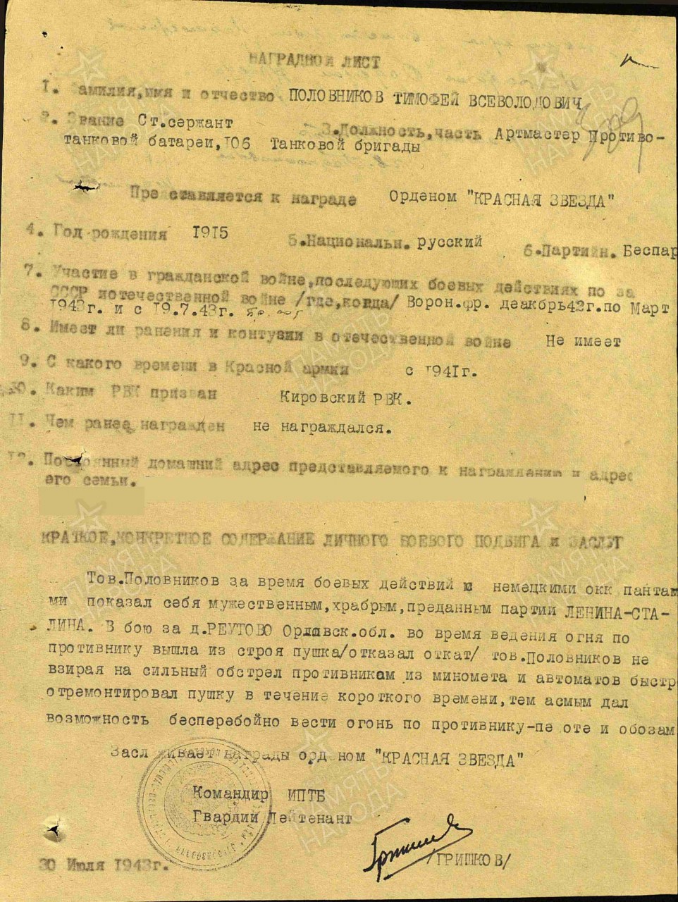| 4304403022 | Половников Тимофей Всеволодович | 1915 г. р., уроженец д. Чичаново, Верховинского р-на, Кировской обл. Призван Просницким РВК, сержант. Пропал без вести в октябре 1943 г. | Кировская область, Кирово-Чепецкий район | |||