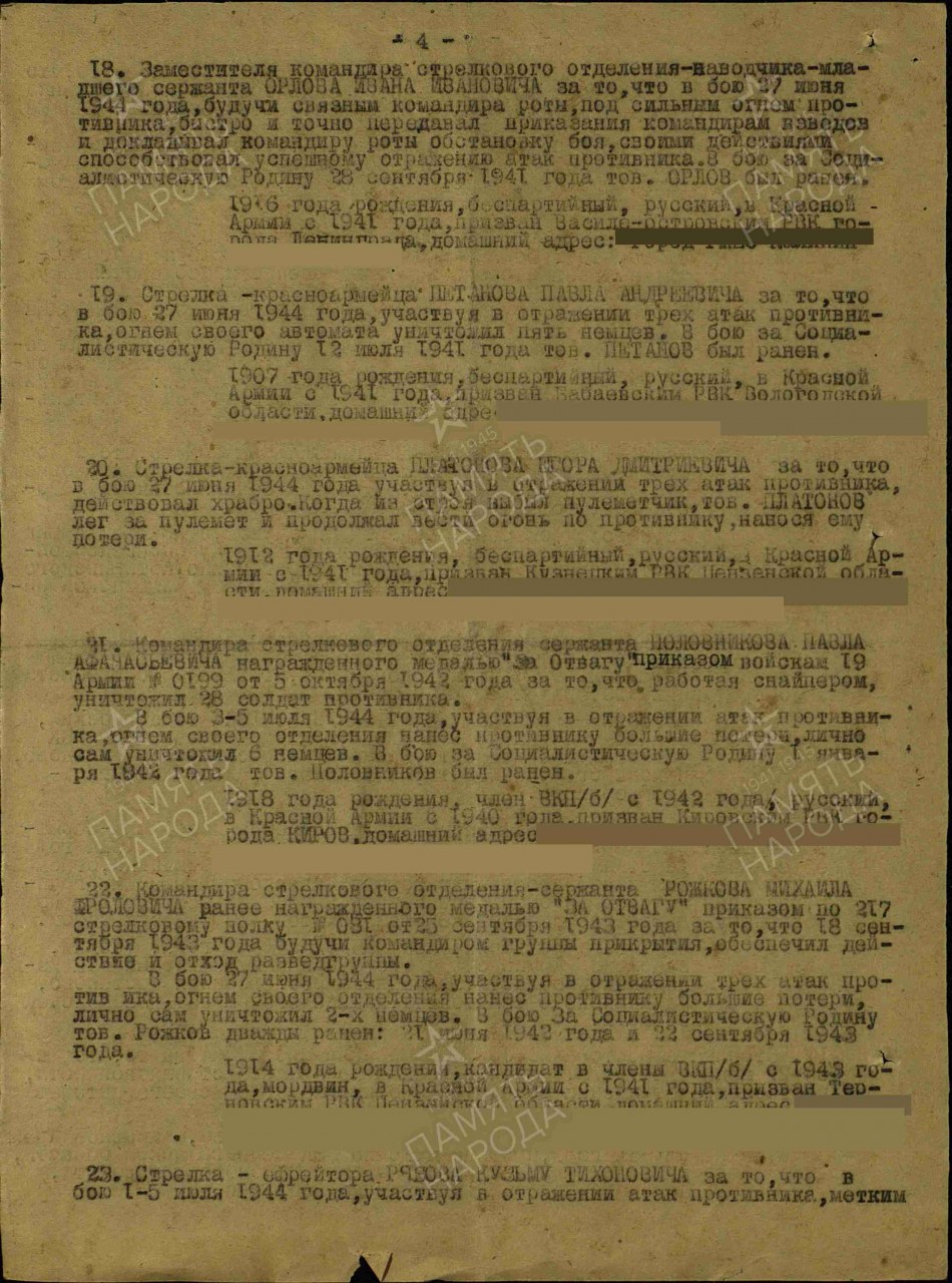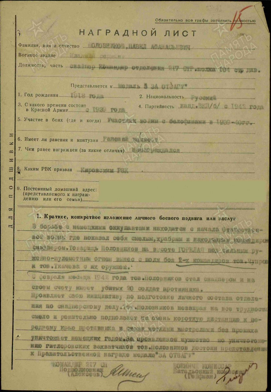 | 4315553023 | ПОЛОВНИКОВ Павел Афанасьевич | 1918 г. р., урож. д. Чигари Великорецкого с/с Верховинского, ныне Юрьянского р-на, красноармеец, стрелок пп 68252т, мобилизован Кировским РВК. Пропал без вести в декабре 1943 г. | Кировская область, Киров |