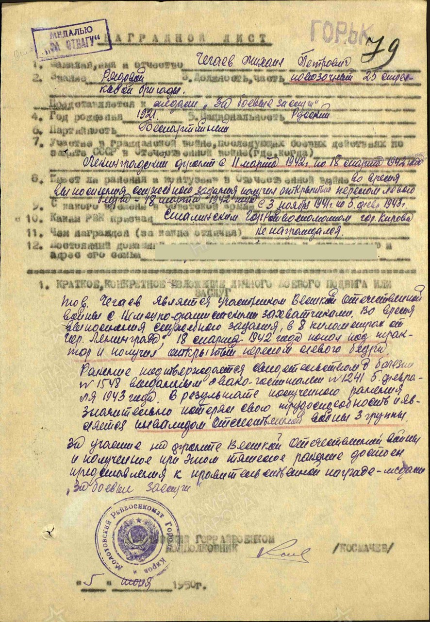 Место призыва: Сталинский РВК, Кировская обл., г. Киров, Сталинский р-н