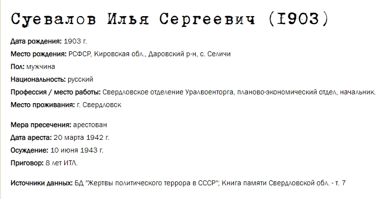 | Книга Памяти | - | Источники данных: БД "Жертвы политического террора в СССР"; Книга памяти Свердловской обл. - т. 7 | |