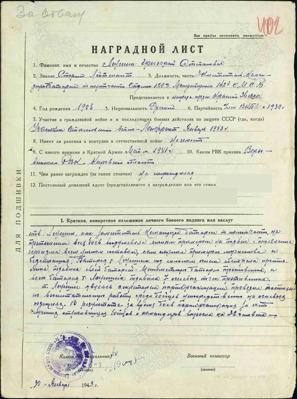 Воинское звание: ст. лейтенант, зам. командира по полит. части 120 мм. минометной батареи
