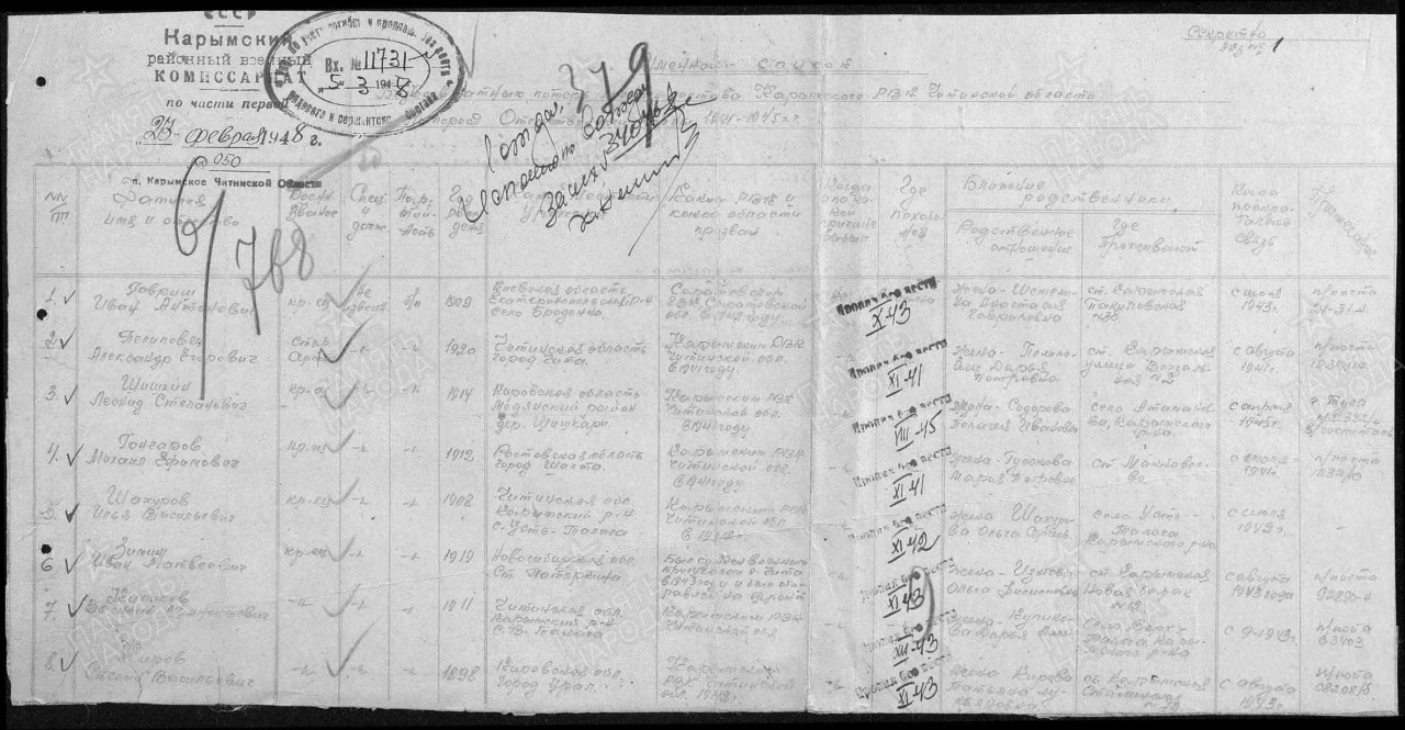 Дата призыва: __.07.1941 Карымский РВК, Читинская обл., Карымский р-н