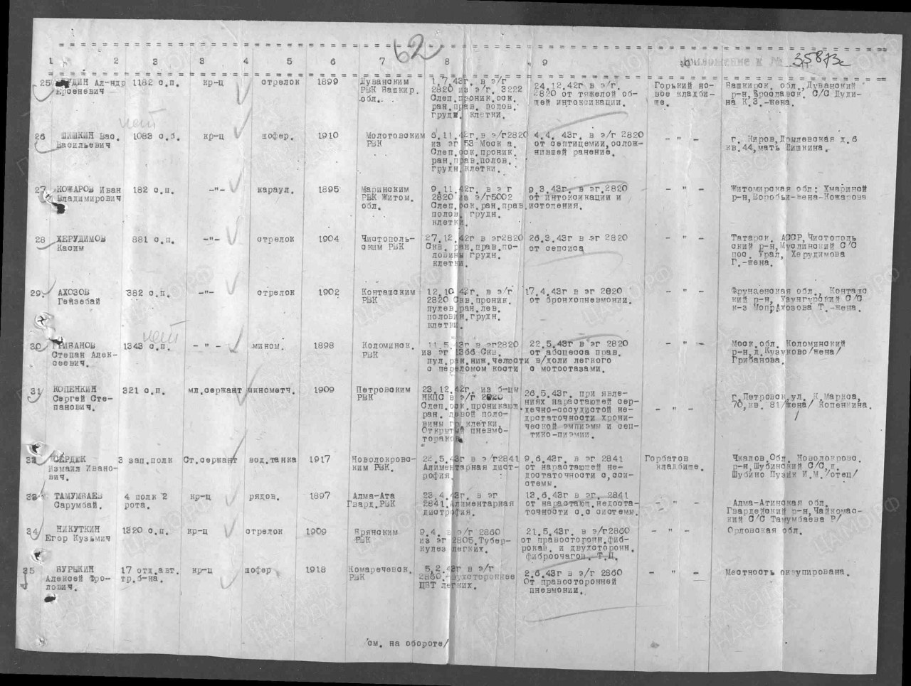 | 4315790026 | ШИШКИН Василий Васильевич | урож. сл. Дымково г. Кирова, кр-ц, стрелок, 1053 сбн, пп 47984ш, мобилизован Сталинским РВК. Умер от ран 04.04.1943 г. в ЭГ-2820. Захоронен в брат. мог. на кладб. г. Горького. | Кировская область, Киров |