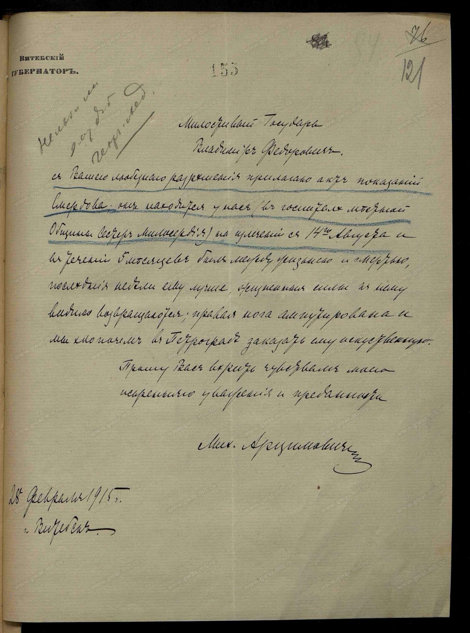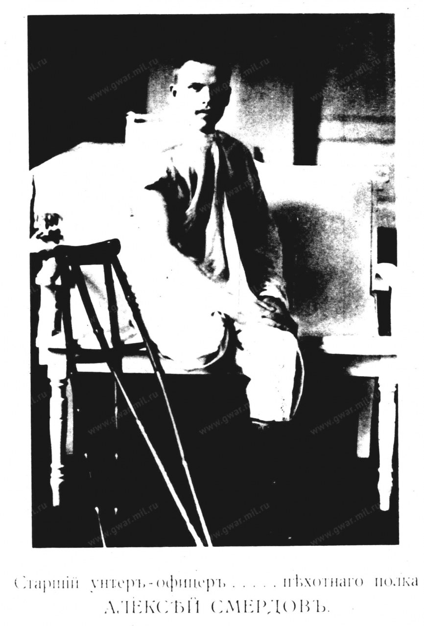 В тот же день, когда отступавшие густыми колоннами германцы, проходя мимо Смердова, застрелили, на его глазах, до 30 человек, лежавших на земле наших тяжело-раненых, к Смердову подошел германский санитар с повязкой Краснаго Креста на левой руке и в ответ на просьбу Смердова знаками перевязать ему ноги, вынул из кармана револьвер и произвел в него два выстрела: первая пуля ударилась в землю, в двух шагах от Смердова, а вторая – попала в правую руку и раздробила кость этой руки, которой Смердов более уже не владеет.