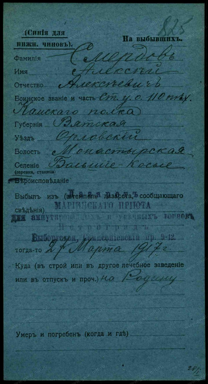 | Родился | 1889 | деревня Косые (Большие Косые, Косое Веретье) (Юрьянский район, Кировская область) - часть другого н.п. | д. Большие Косые, Монастырская волость, Орловский уезд, Вятская губерния, https://gwar.mil.ru |