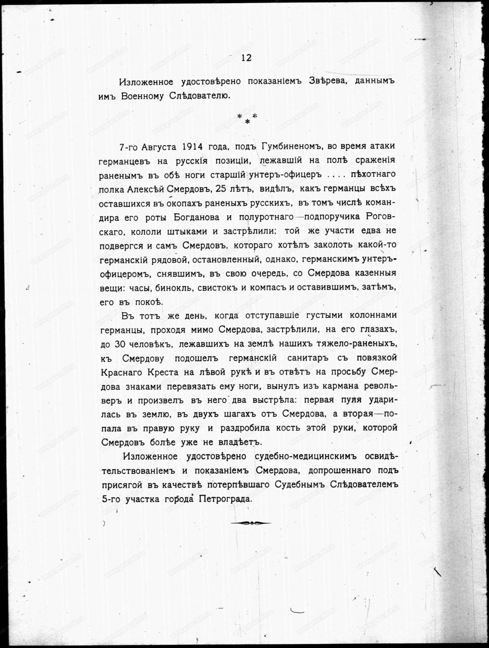 "7-го Августа 1914 года, под Гумбиненом, во время атаки германцев на руссия позиции, лежавший на поле сражения раненым в обе ноги старший унтер-офицер … пехотнаго полка Алексей Смердов, 25 лет, видел, как германцы всех оставшихся в окопах раненых русских, в том числе командира его роты Богданова и полуротнаго – подпоручика Роговскаго, кололи штыками и застрелили; той же участи едва не подвергся и сам Смердов, котораго хотел заколоть какой-то германский рядовой, остановленный, однако, германским унтер-офицером, снявшим, в свою очередь, со Смердова казенныя вещи: часы, бинокль, свисток и компас и оставившим, затем, его в покое.