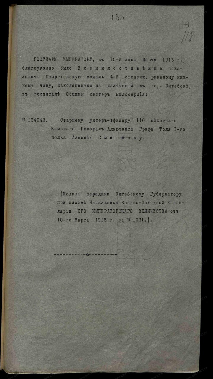 | Служба в армии | - | 110-й пехотный Камский полк, 28-я пехотная дивизия, ст. унтер-офицер | https://gwar.mil.ru |