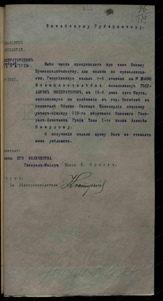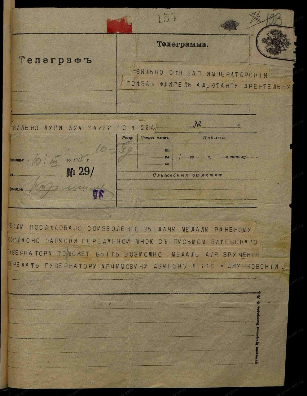 | Награждён: Георгиевской медалью IV-й степени | 10.03.1915 | https://gwar.mil.ru |