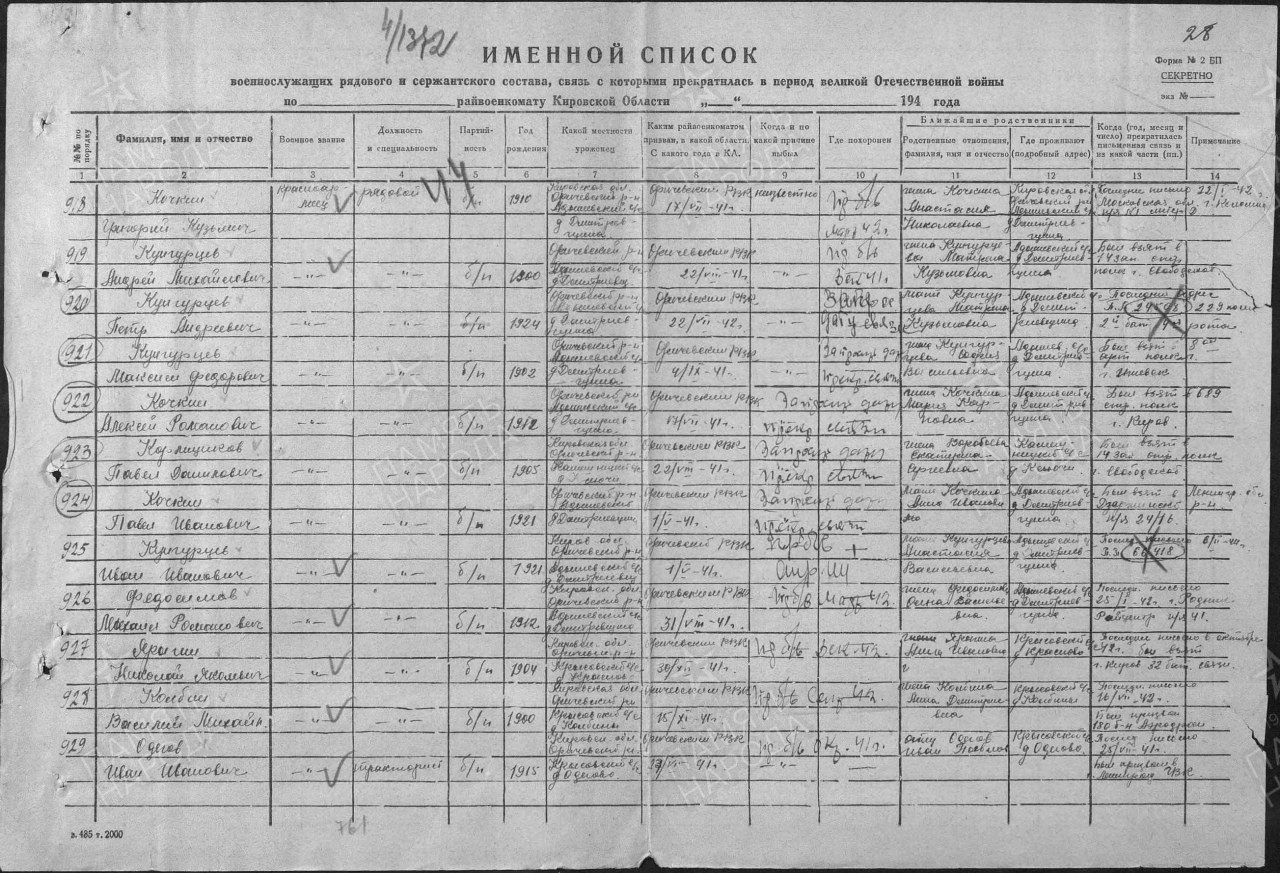 | 4308355014 | КОЧКИН Алексей Романович | 1912 г. р., д. Дмитриевщина, Адышевского с/с, красноармеец, стрелок 689 сп, г. Киров, в сентябре 1941 г. пропал без вести. | Кировская область, Оричевский район | |||