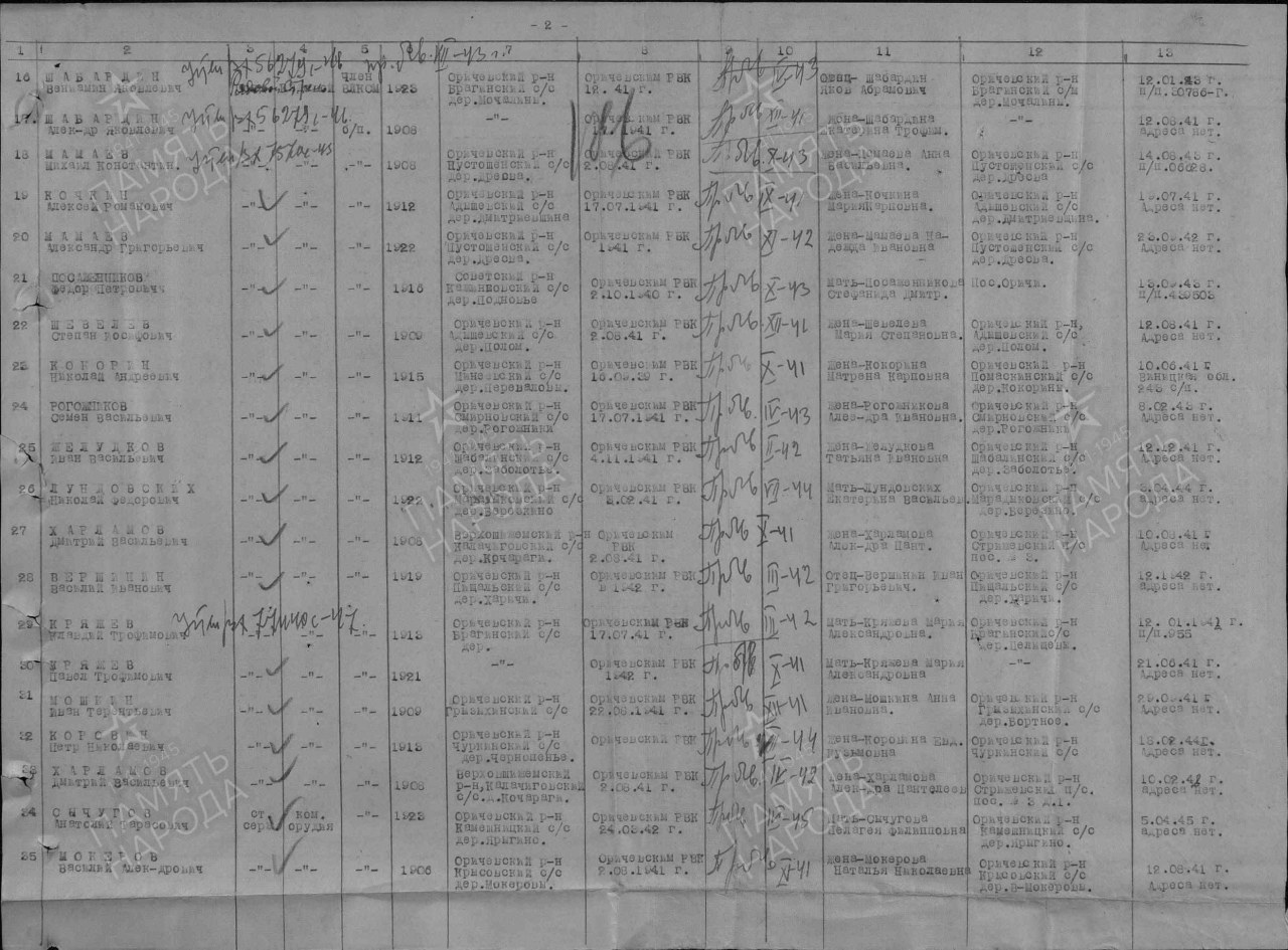 | 4319066017 | КОЧКИН Алексей Романович | 1912 г.р., Адышевский с/с, д. Дмитриевщина. Утрачена связь с сентября 1941 года. Пропал без вести. [Боец 689 сп 411 сд] | Кировская область, Оричевский район |