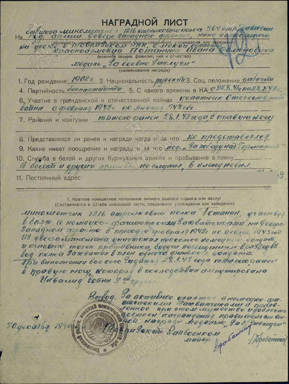 Воинская часть: 1216 сп 364 сд 1 Уд. А СЗФ