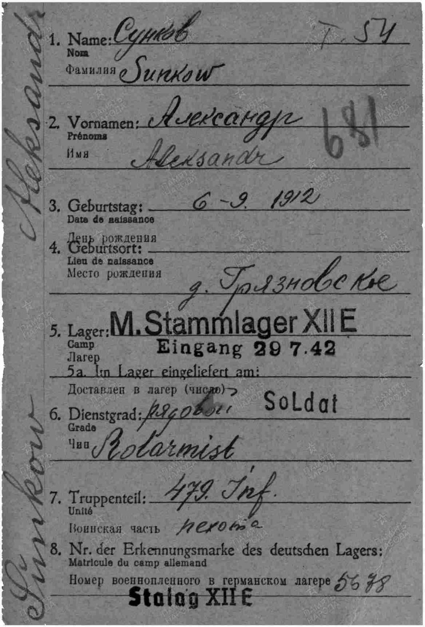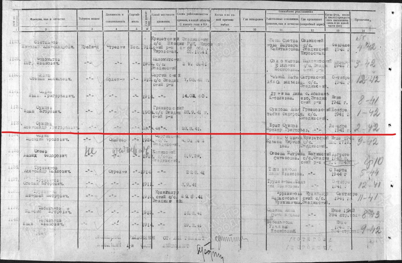 | 4301435010 | СУНЦОВ Александр Григорьевич | 1904 г. р. из д. Грязные, Верхлеманского с/с. Призван Зюздинским РВК, красноармеец. Пропал без вести в феврале 1942 г. | Кировская область, Афанасьевский район | |||