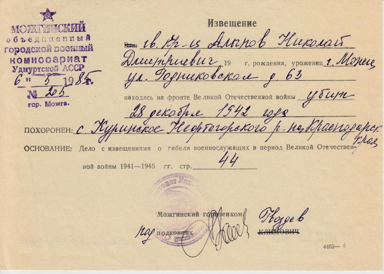 Алыпов Николай Демидович был призван в Советскую Армию в июне 1941 г. Воевал в 73 УР 37 армии. 01.07 1942 г. 73-й УР занял позиции на рубеже Кряковка- Новоахтырка- Чабановка-Федчино в составе Южного фронта. 11.07.42 г. вступили в бой с передовыми танковыми частями немцев. В бою был ранен. После лечения направлен в 180 азсп. Фашисты рвались на Кавказ. Предгорный Апшеронский район превратился в настоящий ад. В боях за г.Куринская Краснодарского края погиб 28.12.1942 г. Мать Мария Дорофеевна получила извещение о гибели сына. В1985 году поисковики школы №25 в г. Куринская установили имена погибших и прислали письмо.родственникам. Брат Николая Алыпов Анатолий Демидович и племянник Александр Афанасьевич съездили в Краснодарский край в станицу Куринская к братскому захоронению с поклоном от всех родных и земляков. Похоронен в с.Куринской Краснодарского края.