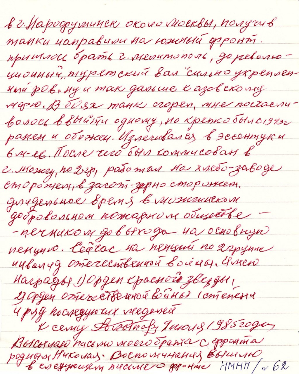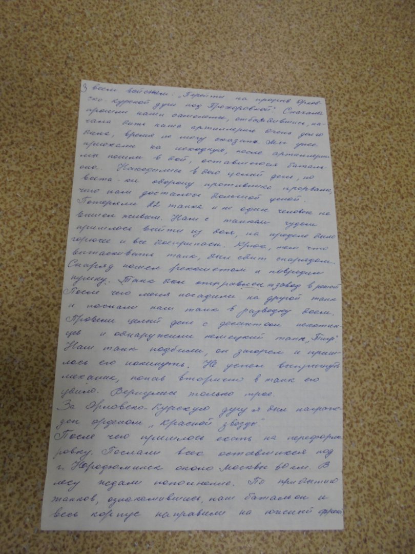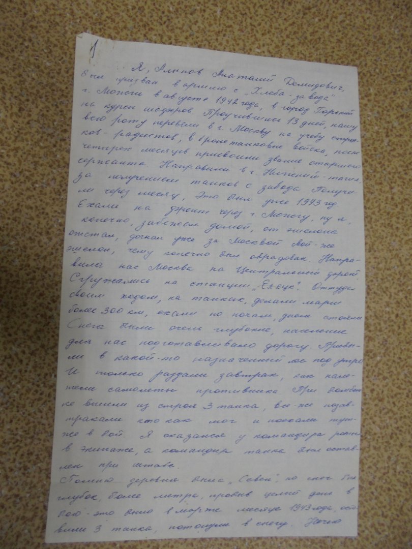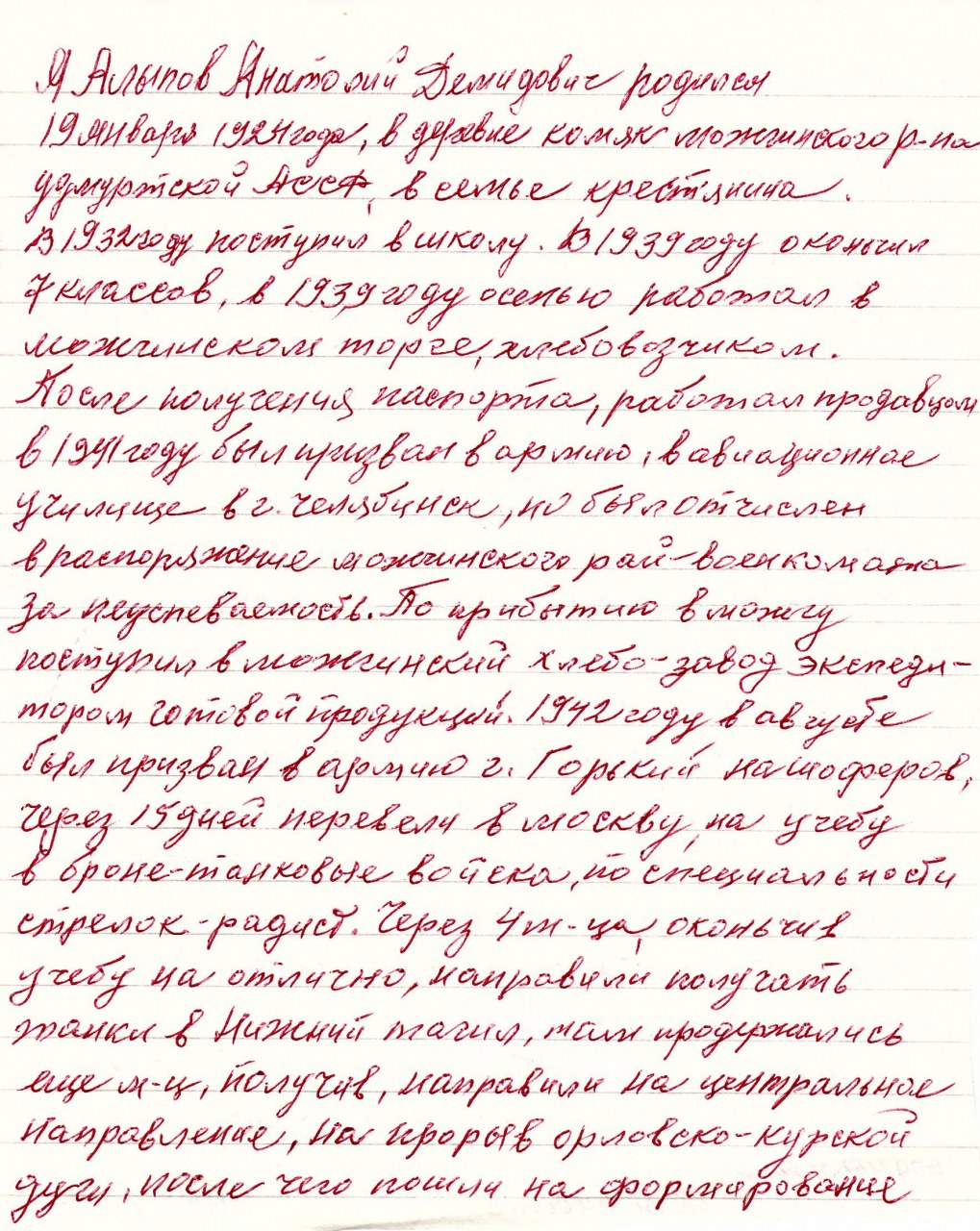 Алыпов Анатолий Демидович призван в ряды Советской Армии в сентябре 1942 г. С 5 по 23 июля 1943 г.Радист танка Командира батальона 202 т.бр 19 тк в составе Центрального фронта принимал участие в Курской стратегической оборонительной операции на северном фасе Курской дуги. Награжден Орденом Красной Звезды. С 26 сентября 1943 г. ппринимал участие в Нижнеднепровской стратегической наступательной операции. Танк был подбит, экипаж погиб, Анатолий обожженный, раненый выбрался из танка и остался раненный на пять дней на нейтральной полосе. Попал в донесение о погибших 31.10.1943 г. Группа разведчиков, возвращавшихся из-за линии фронта, оказали ему помощь, принесли в расположение в/ч и отправили в госпиталь. За этот бой награжден Орденом Отечественной войны ! степени. Длительное лечение, много операций, обожжено более 60% кожи и демобилизация. Медаль за Победу над Германией получил уже 9 мая 1945 г. дома, в родной Можге.