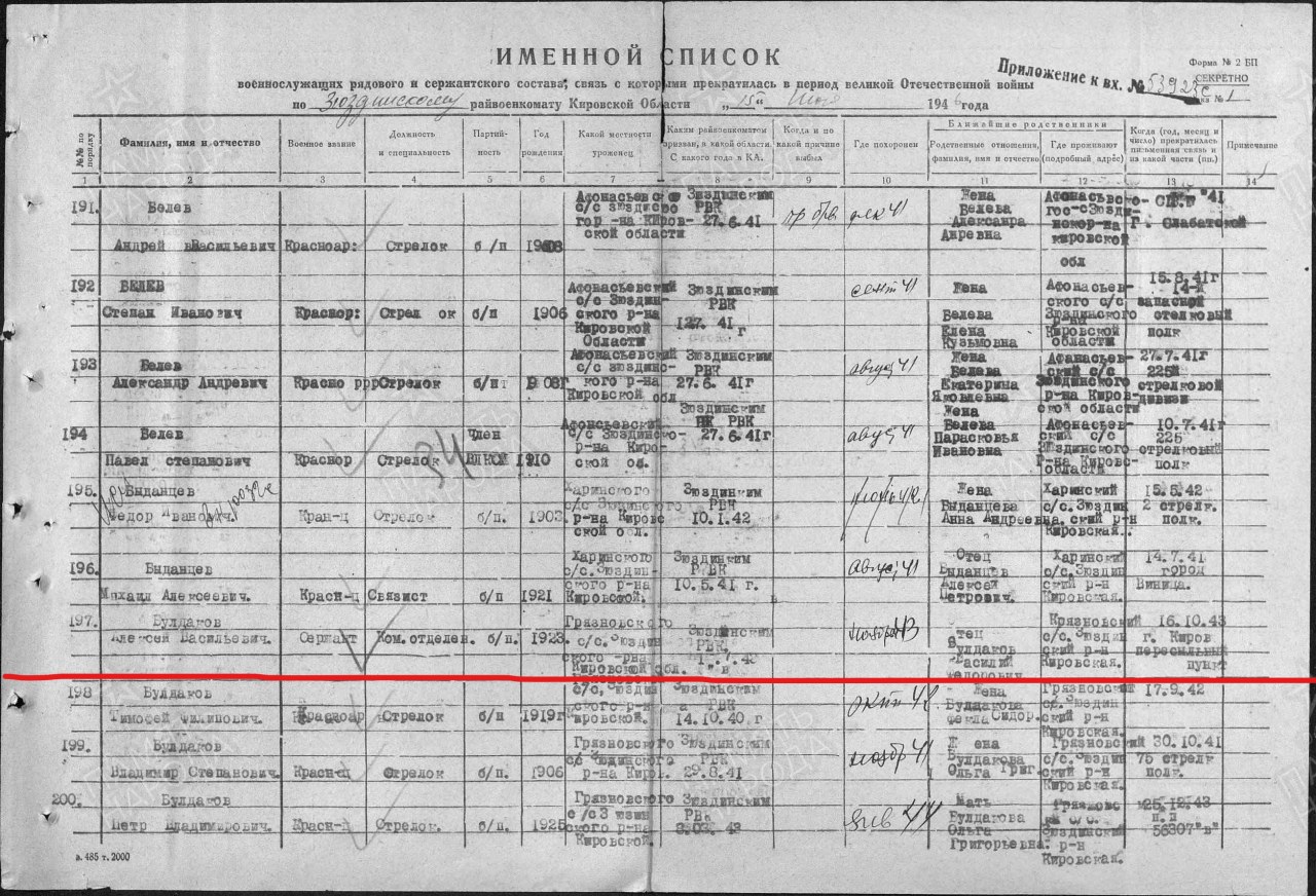 | 4301280010 | БУЛДАКОВ Алексей Васильевич | 1923 г. р. из д. Трушники, Верхлеманского с/с. Призван Зюздинским РВК, красноармеец. Пропал без вести в ноябре 1943 г. | Кировская область, Афанасьевский район |
