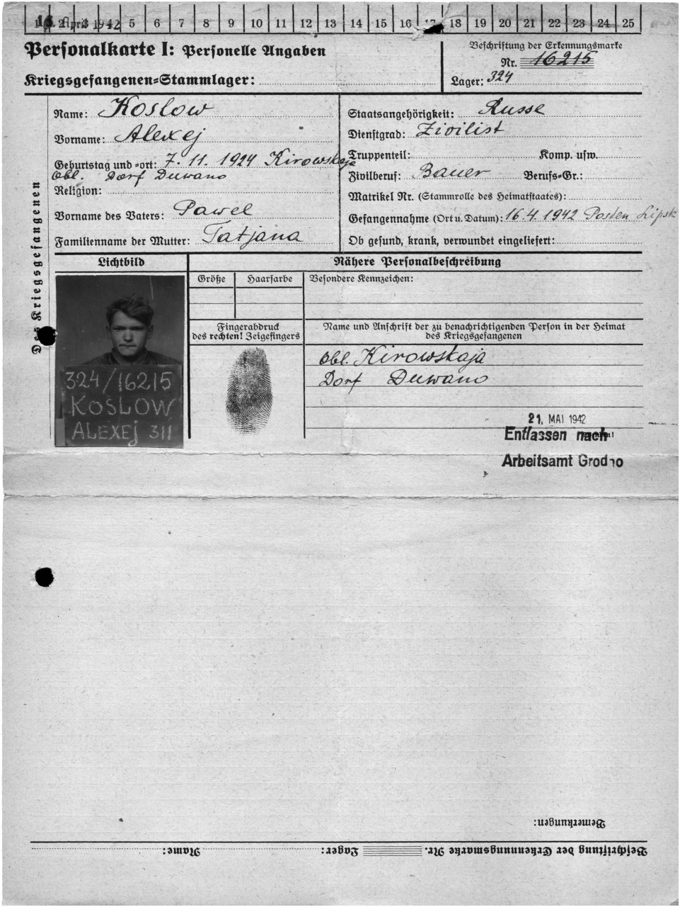 | Попал в плен | 16.04.1942 | www.obd-memorial.ru |