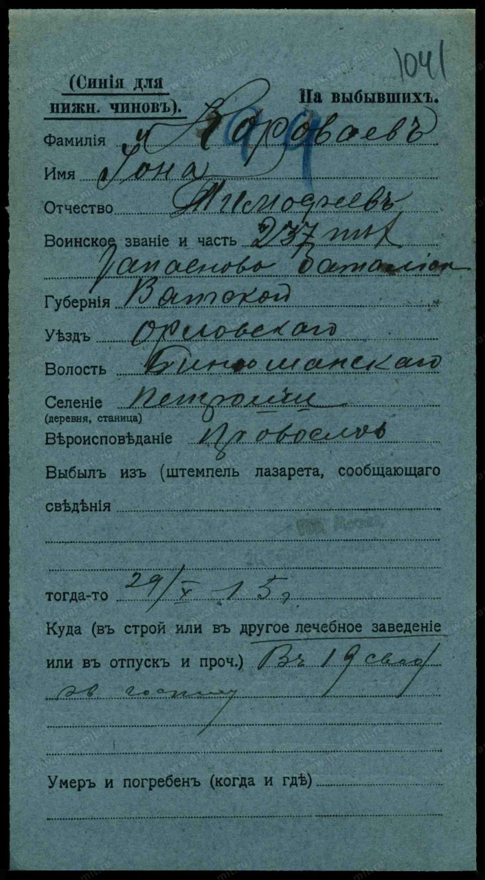 | Женился на: Караваева Елена Антоновна | - | починок Петрушонки (Караваевы, Над речкой Кузюк 5-й) (Мурашинский район, Кировская область) - ныне не существует | Годы жизни 1893-1942 |