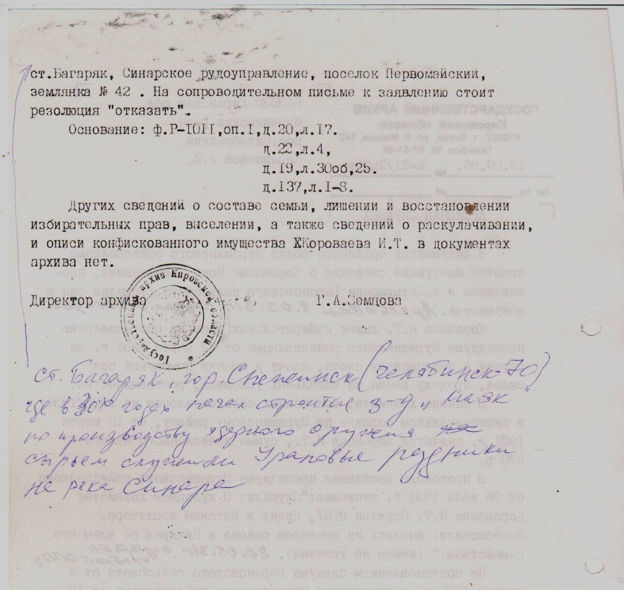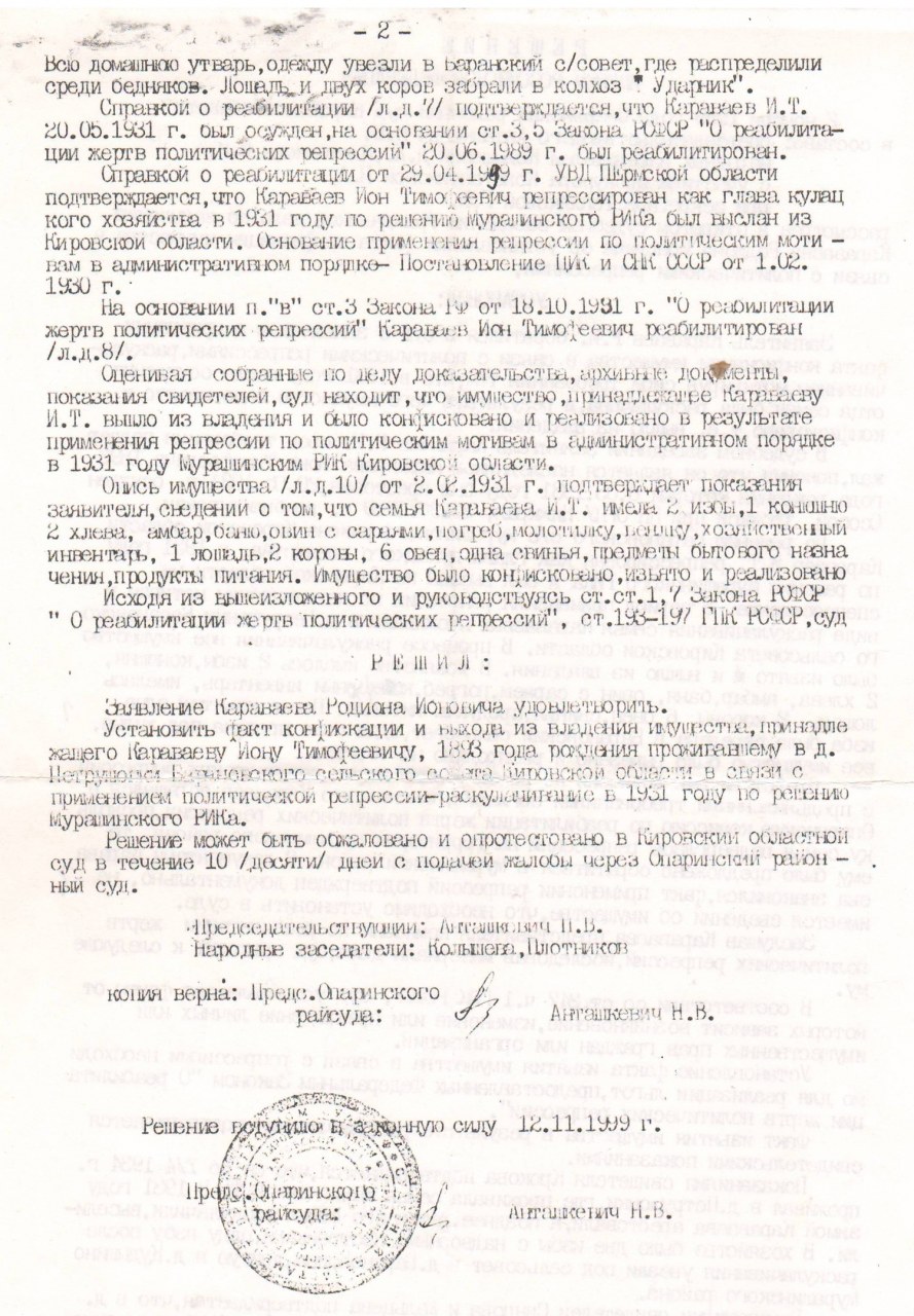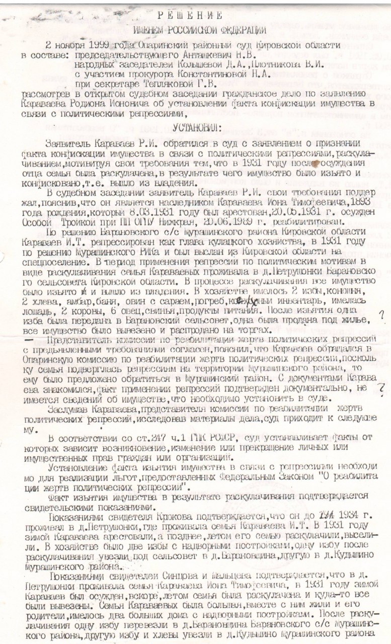 | Осуждение | 22.03.1931 | город Мураши (Мурашинский район, Кировская область) - существующий н.п. | Обвинение: на основании Постановления ЦИК и СНК СССР от 01.02.1930 г. Осуждение: 22.03.1931 Приговор: постановлением президиума Мурашинского райисполкома раскулачены и высланы на спецпоселение в Пермскую обл., пос. Багаряк. |