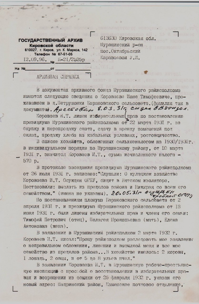 | Изменил место проживания | 1931 | Пермская область, пос. Багаряк | Устинья Ионовна рассказывала, что когда их привезли в г.Пермь, то кулаки из Украины их пожалели. Они говорили, что дома они ничего не делали, а работали у них работники. А наши вятские кулаки даже были в лаптях (все, что у них было отобрали). Дома они работали с утра, до вечера, а соседи до обеда спали. Калинин писал, что дед не подлежит раскулачиванию, но бумаги эти были украдены, вот и деда раскулачили. Был конечно у него дом, корова, овцы, лошадь, пчелы. Все дети там у них умерли, кроме Устиньи Ионовны и её сестры Анны, т. к. они были старшие, а остальные были маленькими. Работали в шахтах, на рудниках, жили в землянках. Конечно Устиньи Ионовны могла с ними не ехать, т.к. она уже была взрослая, но она от семьи не отстала. Там умерли и Тимофей Петрович и Пелагея Прокопьевна |