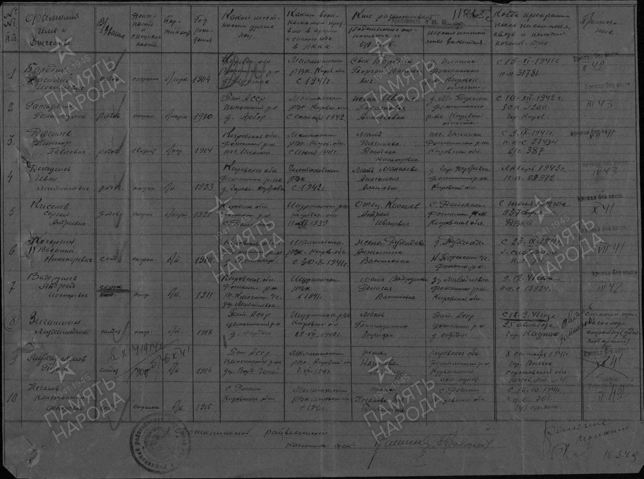 | 4306374029 | ДЯГИЛЕВ Никанор Павлович | 1914 г. р., из д. Шишинерь Рожкинского с/с, красноармеец, связист, ппс 274, в/ч 387, в декабре 1941 г. пропал без вести. | Кировская область, Малмыжский район |