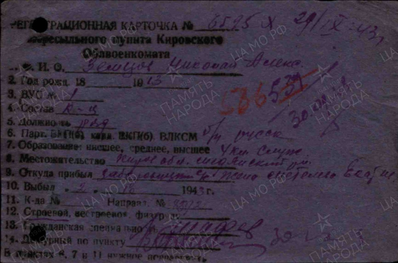 Военно-пересыльный пункт: Кировский ВПП Выбытие из воинской части: 02.10.1943