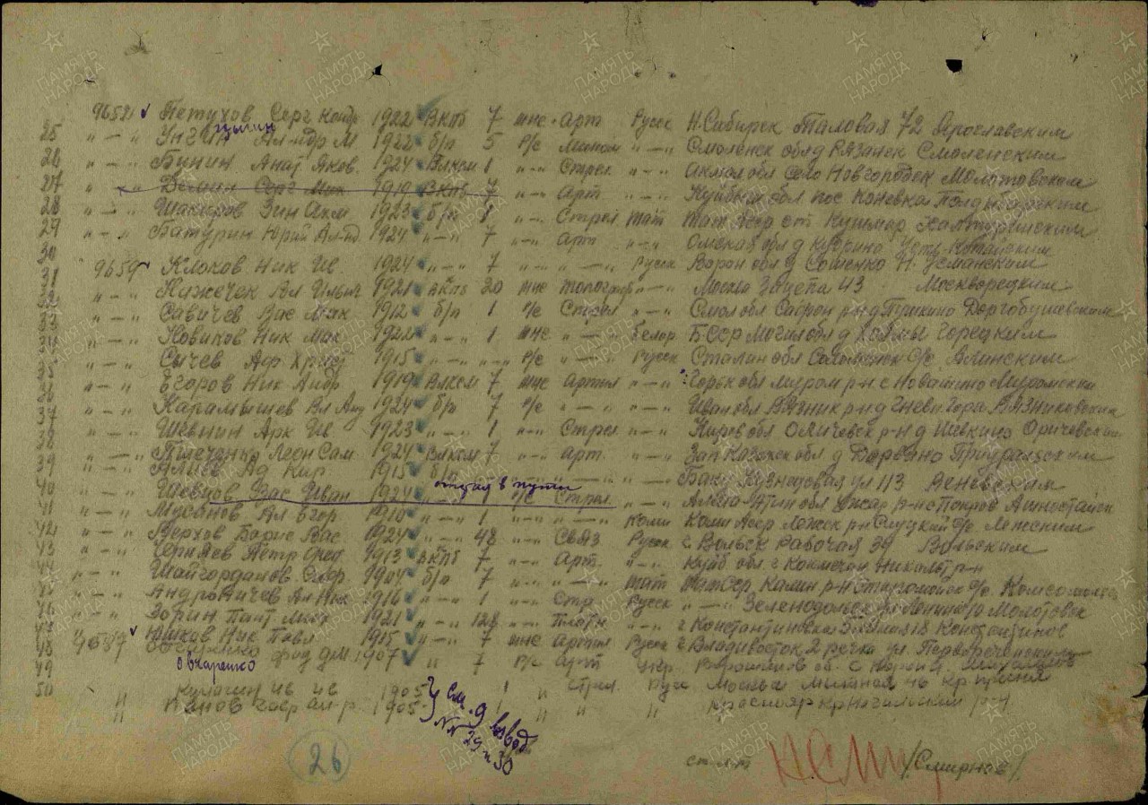 | участие в Великой Отечественной войне 1942 - 1944гг. | 1942 - 06.11.1944 | 1.Воинское звание: красноармеец Военно-пересыльный пункт: СПП Московского городского военкомата Прибыл в часть: 20.04.1943 Откуда прибыл: Московский Военно-Пересыльный пункт, г. Москва Информация об архиве - Источник информации: ЦАМО Фонд ист. информации: СПП Московского ГВК Опись ист. информации: 179516 Дело ист. информации: 61 2.Воинское звание: рядовой Военно-пересыльный пункт: СПП Московского ГВК Выбытие из воинской части: 25.04.1943 Куда выбыл: 1 гвардейский танковый корпус. Номер команды: Волга. Информация об архиве - Источник информации: ЦАМО Фонд ист. информации: СПП Московского ГВК Опись ист. информации: 179522 Дело ист. информации: 37 3.Воинское звание: рядовой Воинская часть: гв. развед. в/ч 15. | |