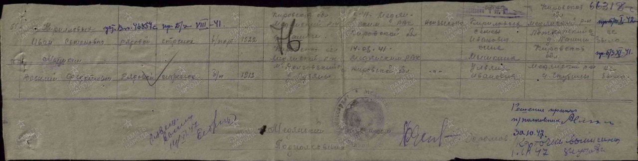 Дата призыва: 14.08.1941 Медянский РВК, Кировская обл., Медянский р-н