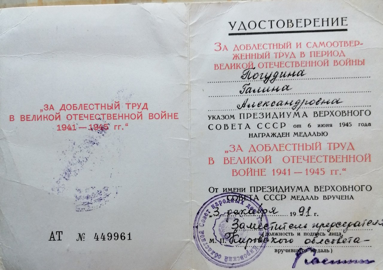 Галина Александровна родилась в д.Лопатино 13 сентября 1928 года. Была третьим ребенком. В первый класс пошла в 1937 году. Учиться старалась. В 1941 году закончила 5 классов. Было тяжело семье. Они переехали в дер. Васькино. Ее мама очень часто болела, поэтому маленькая Галя оставила учебу и пошла работать в колхоз. Выполняла посильную работу: косила траву, ездила за сеном, возила навоз. В 1947 году пошла работать на торфопредприятие, откуда ее отправили учиться на техника. На торфопредприятии работали в две смены. Зимой выкорчевывали пни, копали канавы. А молодая девушка мечтала научиться шить. Работая, она бегала учиться в дер.Мокрушинцы (за 5 км от Васькино) к швейному мастеру Кузнецову Андрею Ивановичу и в 1949 году она поступила на работу в Просницкий промкомбинат, в швейный цех. На работу приходили пораньше, что бы до рабочего дня протопить печи. В промкомбинате мастерству ее обучал Тимофей Филатович, который строил выкройки от руки, без лекал. С этой работы их посылали на заготовку дров, на изготовление кирпичей, на сенокос, на пилораму. В 1951 году вышла замуж за Погудина Василия Ивановича. В 1959 году швейный цех из промкомбината перевели в швейную мастерскую Просницкого Дома Быта. Шили по 4 вещи в месяц. Многие операции выполнялись вручную. Но постепенно ручной труд вытеснялся машинами. На предприятии стали создаваться бригады. Галина Александровна была закройщиком верхней одежды и бригадиром. Ее бригада в месяц изготавливала более 90 вещей. Как говорили о ней люди, проработавшие с ней больше 50 лет, Галина не гналась за "длинным рублем". Всегда работала на совесть. За свой труд неоднократно награждалась ценными подарками. Успевала и домашнее хозяйство вести. Всегда была хлебосольна, приветлива. Никогда никого не осуждала. У нее было еще четверо братьев и сестер. И всегда все знали у кого будут отмечать праздники или какие-то значимые события..