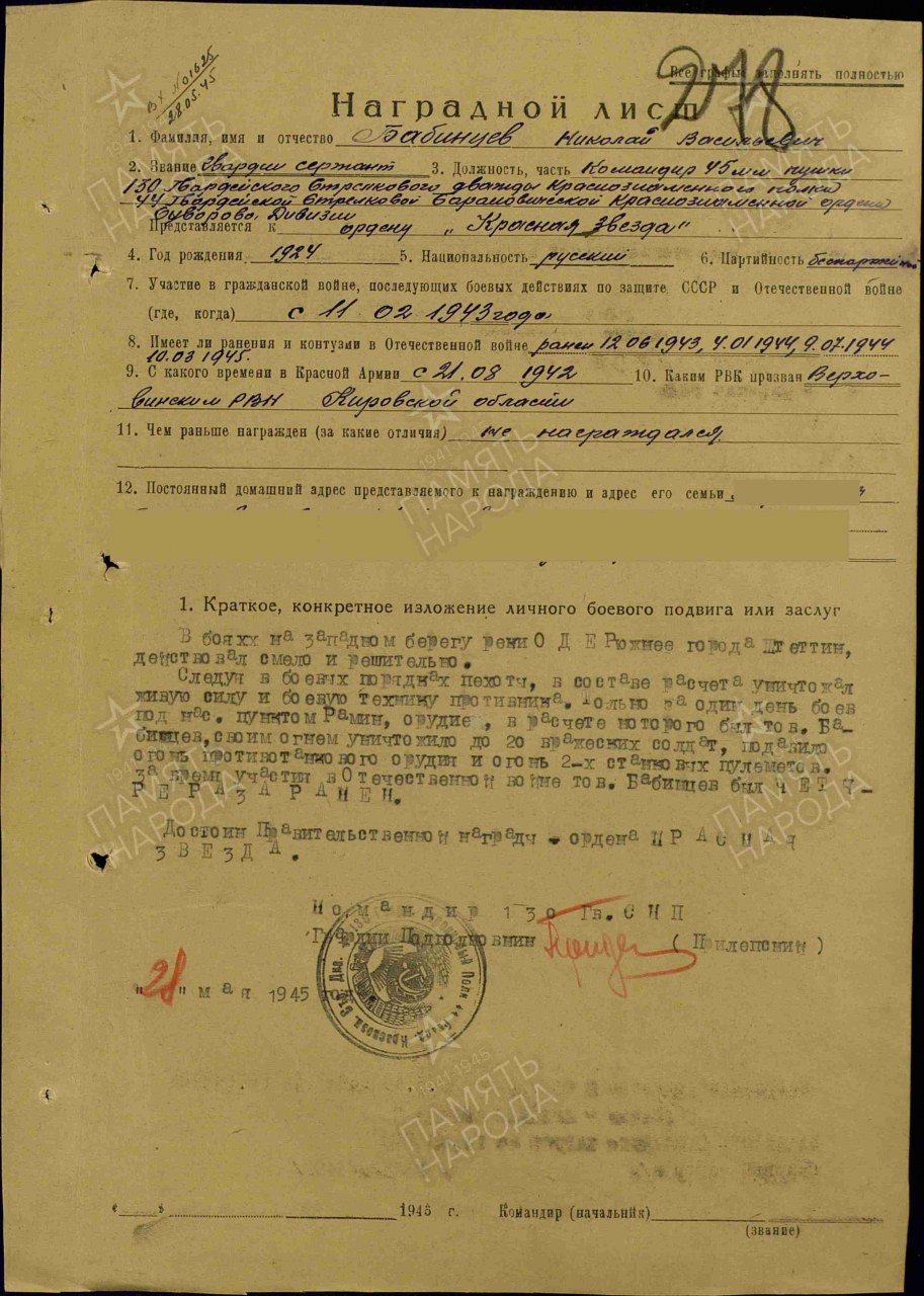 Место призыва: Верховинский РВК, Кировская обл., Верховинский р-н