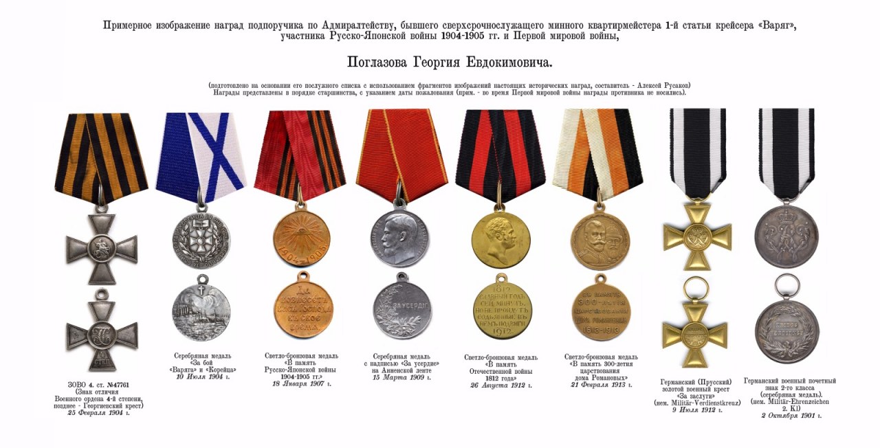 | Дальнейшая служба | 10.12.1904 - 30.12.1914 | Приказом Командира Порта Императора Александра III за №290 зачислен в команду броненосца береговой обороны «Генерал-адмирал Апраксин» 5 мая 1904 года. В 1904 году на броненосце береговой обороны «Генерал-адмирал Апраксин» находился во внутреннем плавании. 10 декабря 1904 года Приказом командира Порта Императора Александра III за №804 переведен в 6-й флотский экипаж. В 1906 году на миноносцах №103 и №104 находился во внутреннем плавании. 4 ноября 1906 года Приказом по Морскому Ведомству за №288 переведен в новый 5 флотский экипаж. В 1907 году на миноносце №128 во внутреннем плавании. С 8 мая по 15 сентября 1908 годна находился во внутреннем плавании на миноносце №213 в составе учебно-минного отряда под начальством контр-адмирала Лилье. 29 июля 1908 года Приказом по Морскому Ведомству за №179 за расформированием 5 экипажа переведен в 1-й Балтийский флотский экипаж. 15 марта 1909 года Приказом Начальника 2-го дивизиона резервной дивизии миноносцев за №33 награжден серебряной медалью на Анненской ленте для ношения на груди за выслугу 5 лет в кондукторском звании. В 1909 году на миноносце №213 во внутреннем плавании в составе учебно-минного отряда. В 1910 году на миноносце №141 во внутреннем плавании в составе учебно-минного отряда. Циркуляром Штаба Начальника Действующего флота Балтийского моря за №9 переведен в команду линейного корабля «Андрей Первозванный» 31 января 1911 года. Циркуляром Штаба Кронштадтского порта за №350 зачислен в команду линейного корабля «Андрей Первозванный» 24 февраля 1911 года. С 5 февраля по 30 июня и с 1 июля по 31 декабря 1911 года на линейном корабле «Андрей Первозванный» во внутреннем плавании и вооруженном резерве. Приказом по Морскому Ведомству за №172 переименован в кондукторы электрики 17 июня 1911 года. С 1 января 1912 года по 1 января 1913 года кондуктор Поглазов на линейном корабле «Андрей Первозванный» находился в заграничном и внутреннем плавании в составе бригады линейных кораблей Эскадры Балтийского моря. В 1912 году линейном корабле «Андрей Первозванный» участвовал в встрече российского императора Николая II с германским императором Вильгельмом II в Балтийском порту. По итогу прошедшей 22 июня (4 июля) 1912 года встречи пожалован золотым военным крестом «За заслуги». 26 августа 1912 года Егор Поглазов на основании Высочайшего повеления, последовавшего в 15-й день Августа 1912 года пожалован светло-бронзовой медалью «В память 100-летия Отечественной войны» на Владимирской ленте. 21 февраля 1913 года он был пожалован светло-бронзовой медалью «В память 300-летия царствования дома Романовых». С 1 апреля по 1 ноября 1913 года кондуктором электрик Поглазов на линейном корабле «Андрей Первозванный» под командою Капитана 1-го ранга Зеленаго-2 был во внутреннем и заграничном плавании. С 1 января по 31 марта 1913 года и с 1 ноября по 8 апреля 1914 года на линейном корабле «Андрей Первозванный» находился в вооруженном резерве. С 9 апреля по 1 июля и с 1 июля 1914 года по 13 января 1915 года на линейном корабле «Андрей Первозванный» был во внутреннем плавании. | |