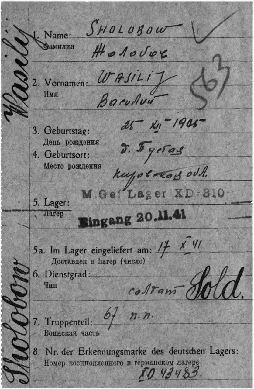 Жолобов Василий Афанасьевич, 1911 (1905) г.р., уроженец д. Пустая Чуркинского с/с Оричевского р-на. Проживал в д. Малышиха Помаскинского с/с. Рабочий, Оричевское заготзерно. Мобилизован Оричевским РВК 18.07.1941 г. в 689 сп. Фактически: красноармеец, санитарная рота 1067 сп, 311 сд (есть в списке принявших присягу санитарной роты 1067 сп под № 28). Последнее письмо 12.08.1941 г. Адреса нет. Попал в плен 25.08.1941 г. под г. Чудово. Погиб в плену. Умер в декабре 1941 г. Лагерь: шталаг X D (310). Лагерный номер: 43483.