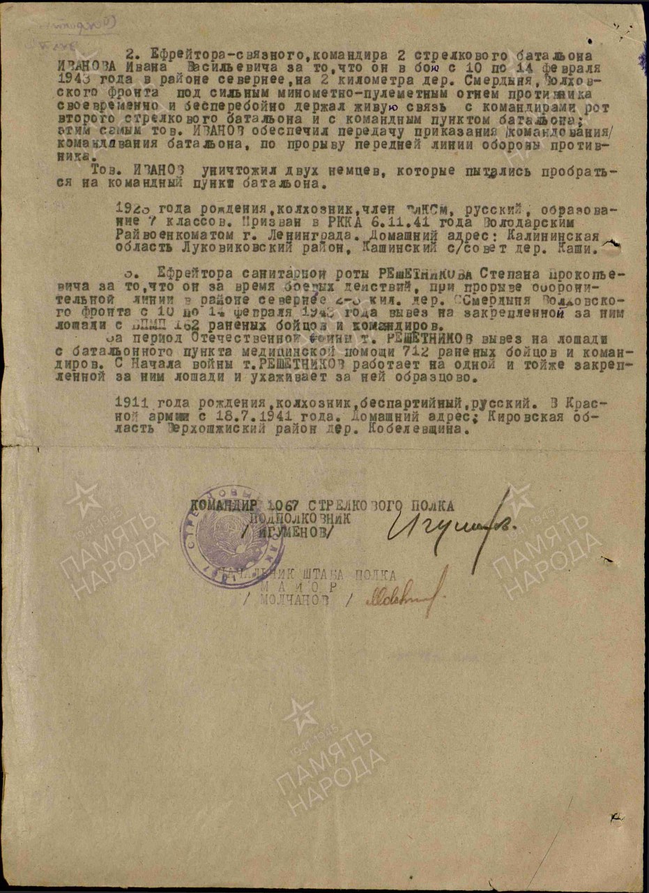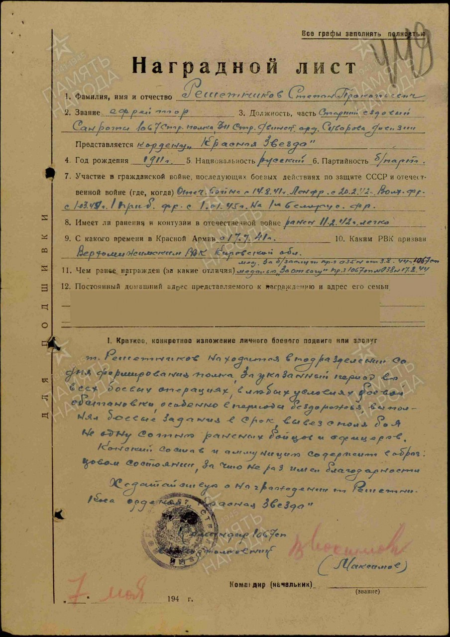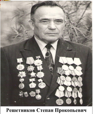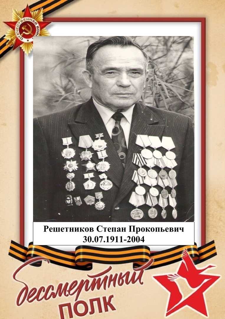 Решетников Степан Прокопьевич, 1911 г.р., уроженец д. Башляки Сунского района, проживал перед мобилизацией в д. Кобелевщина Верхошижемского р-на Кировской области. Мобилизован Верхошижемским РВК 18.07.1941 г. Принял присягу 24.07.1941 г. в г. Кирове в 1067 сп. Красноармеец, ефрейтор, ездовой, старший ездовой, санитарная рота 1067 стрелковый полк 311 стрелковая дивизия. Всю Великую Отечественную войну прошёл в одном подразделении. Один раз ранен. Награжден: медали "За боевые заслуги" (две), "За отвагу", ордена Красной Звезды, Отечественной войны II степени. В 1949 году из Кировской области переехал в Пермскую область (Пермский край). Умер 27.05.2005 г.