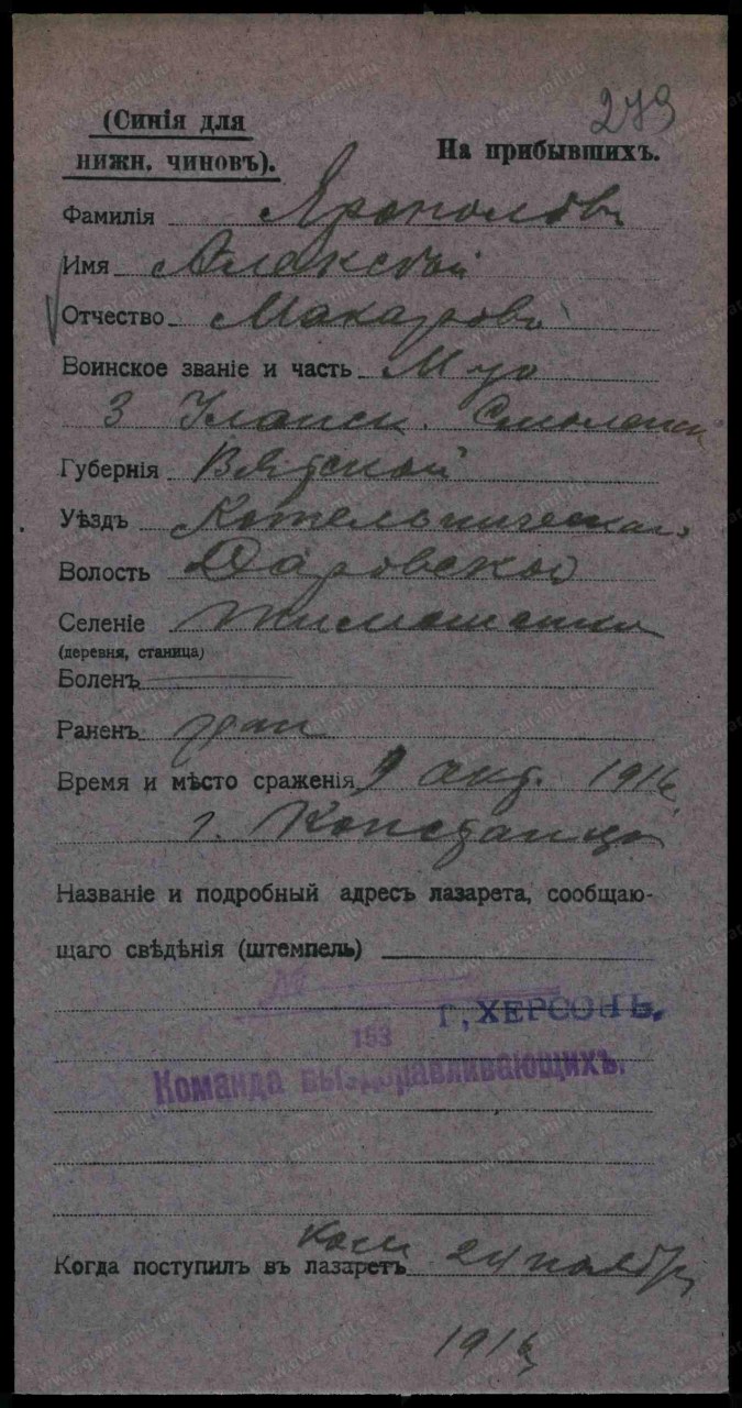| участие в Первой Мировой войне | 1914 - 1918 | Должность/Звание мл. унтер-офицер Воинская часть 3-й уланский Смоленский полк Место рождения Вятская губ., Котельничский уезд, Даровская вол., починок Тимошонки Причина выбытия ранен/контужен Дата выбытия 09.10.1916 Дата события 24.11.1916 Место события г. Констанцо Тип документа Карточка на прибывших (нижние чины) Архив Российский Государственный Военно-исторический архив Фонд Картотека бюро учета потерь в Первой мировой войне (офицеров и солдат) Шкаф без номера Ящик 4074-Я |