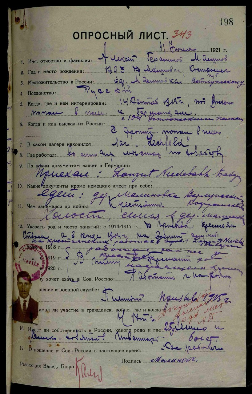 | Родился | 1893 | д. Малиновка, Ветлужский уезд, Костромская губерния, https://gwar.mil.ru |
