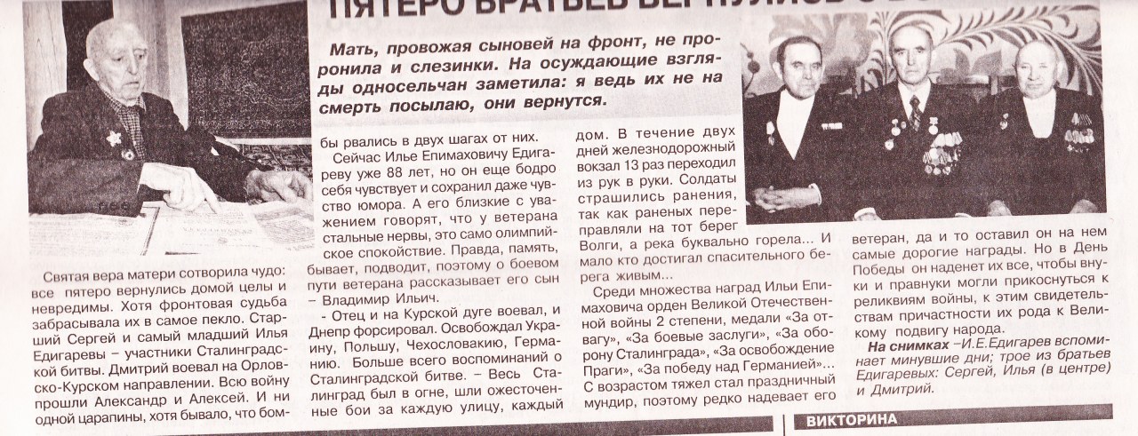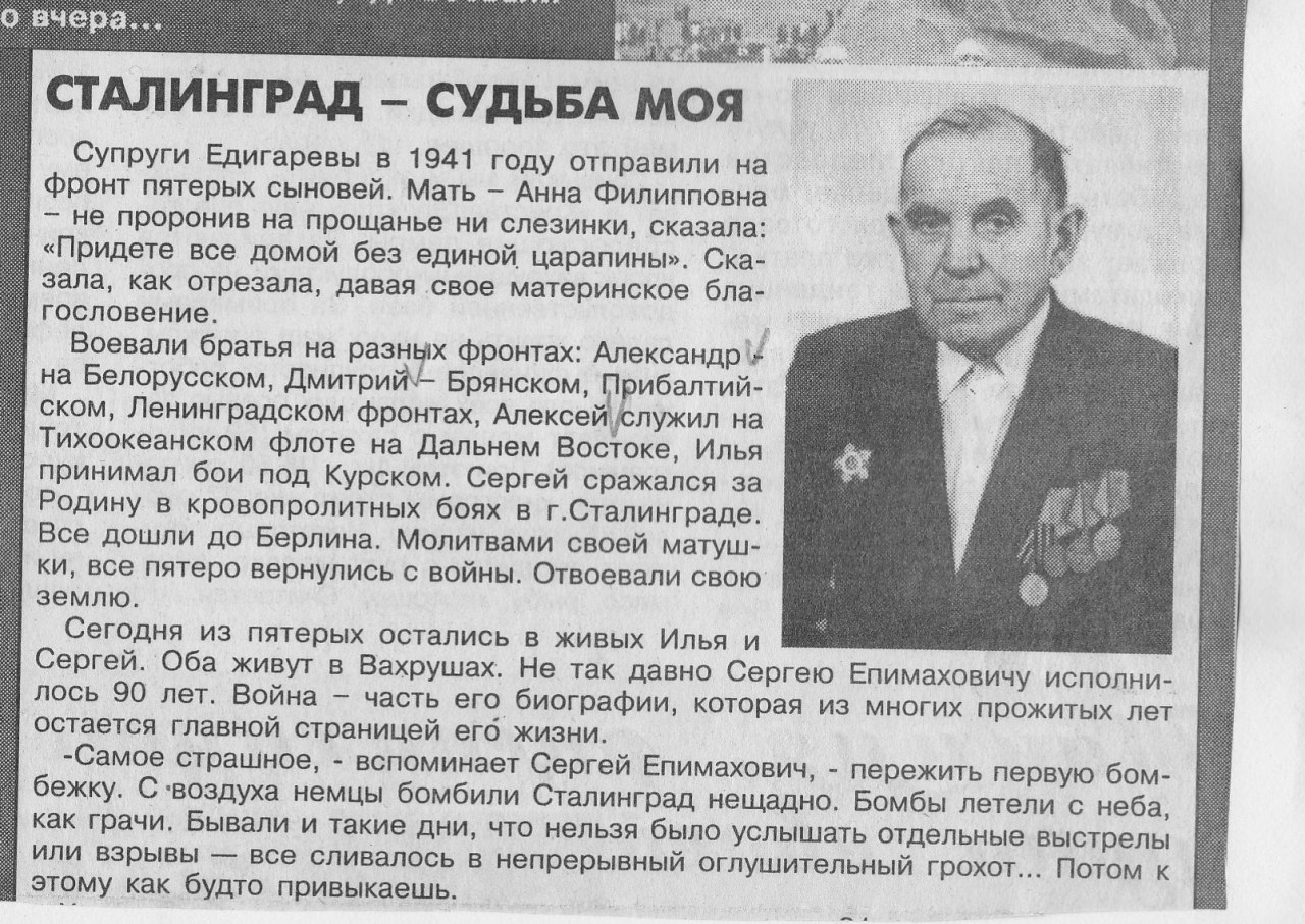 Несломленные войной и годами: [Сергей, Илья, Александр, Дмитрий, Алексей Епимаховичи, Анна Филипповна Едигаревы] // Вахрушевский кожевник. – 2009. – 30 апреля.
