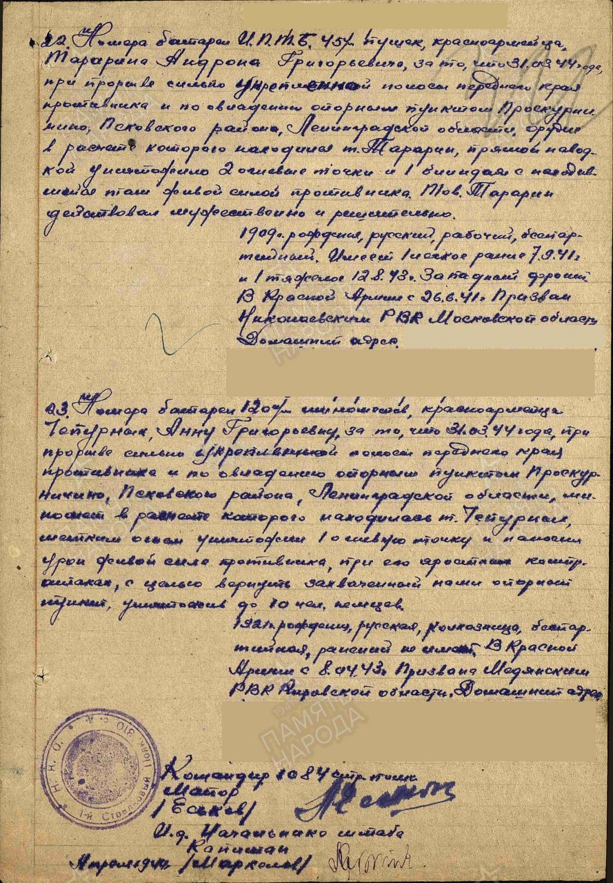 Воинское звание: красноармеец, номер 120 мм минометной батареи