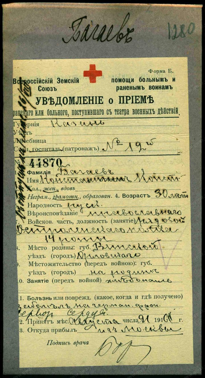 | заболел | 21.08.1916 | Заболел на Германском фронте ..... сердце. |