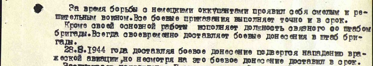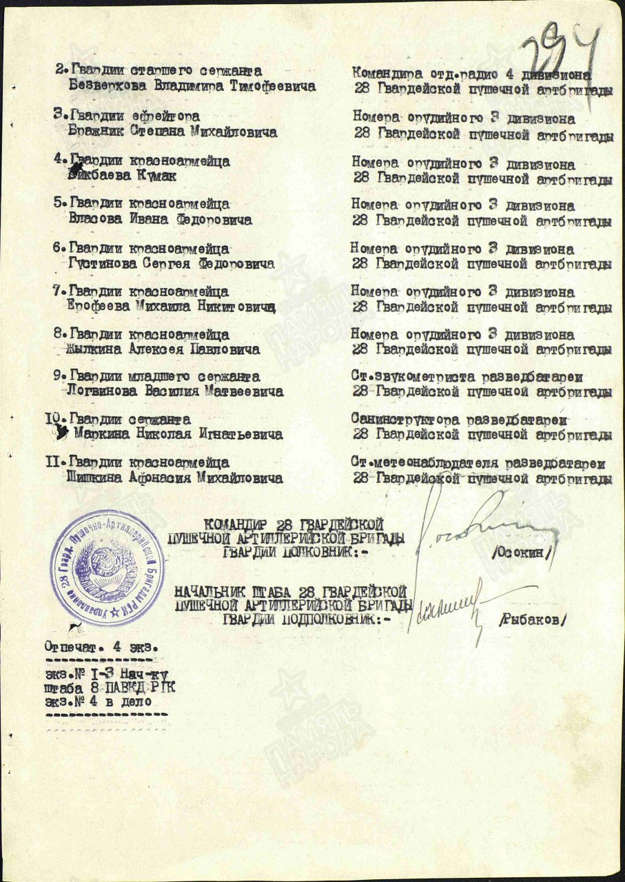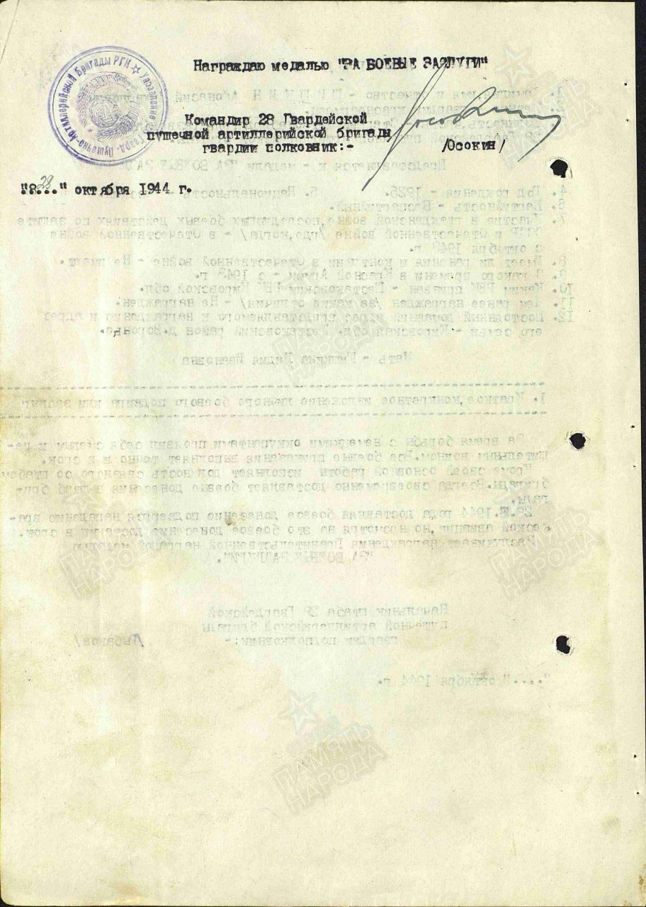 | Награждён: Медаль «За боевые заслуги» | 28.08.1944 | Звание: гв. красноармеец в РККА с 1943 года Место призыва: Шестаковский РВК, Кировская обл., Шестаковский р-н Место службы: 28 гвардейская. пушечно - артиллерийская бригада РГК Дата подвига: 28.08.1944 Приказ подразделения №: 33/н От: 28.10.1944 Издан: 28 гв. пабр пад РГК Архив: ЦАМО Фонд: 33 Опись: 686196 Единица хранения: 736 № записи 22972153 | |