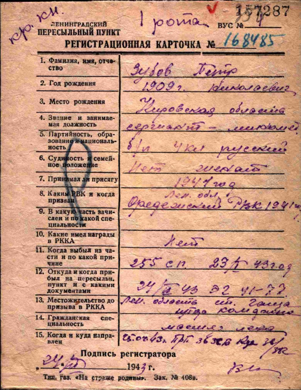 | 1922414 | Зубов Петр Николаевич | Род. 1909, Архангельская обл., Подосиновский р-н, д. Тчанниково, Октябрьский с/с Национальность: русский Проживание: — Занятие: командир расчета 2 минометной роты 942 стрелкового полка 268 стрелковой дивизии. | Обвинение: по ст. 58 п. 10 УК РСФСР Осуждение: 28.07.1943, Военный трибунал 268 стр. дивизии Приговор: 10 лет лишения свободы с поражением в правах на 5 лет, с конфискацией 75 рублей. | Дата: 30.03.1998 | Книга Памяти Кировской обл. (тт. 1-4) |