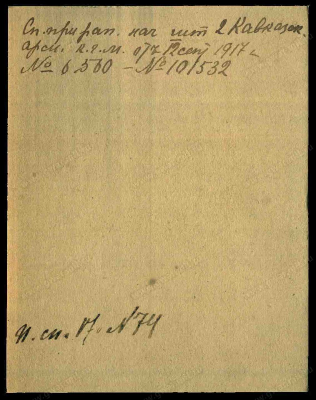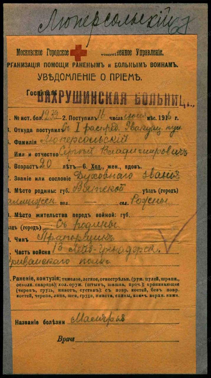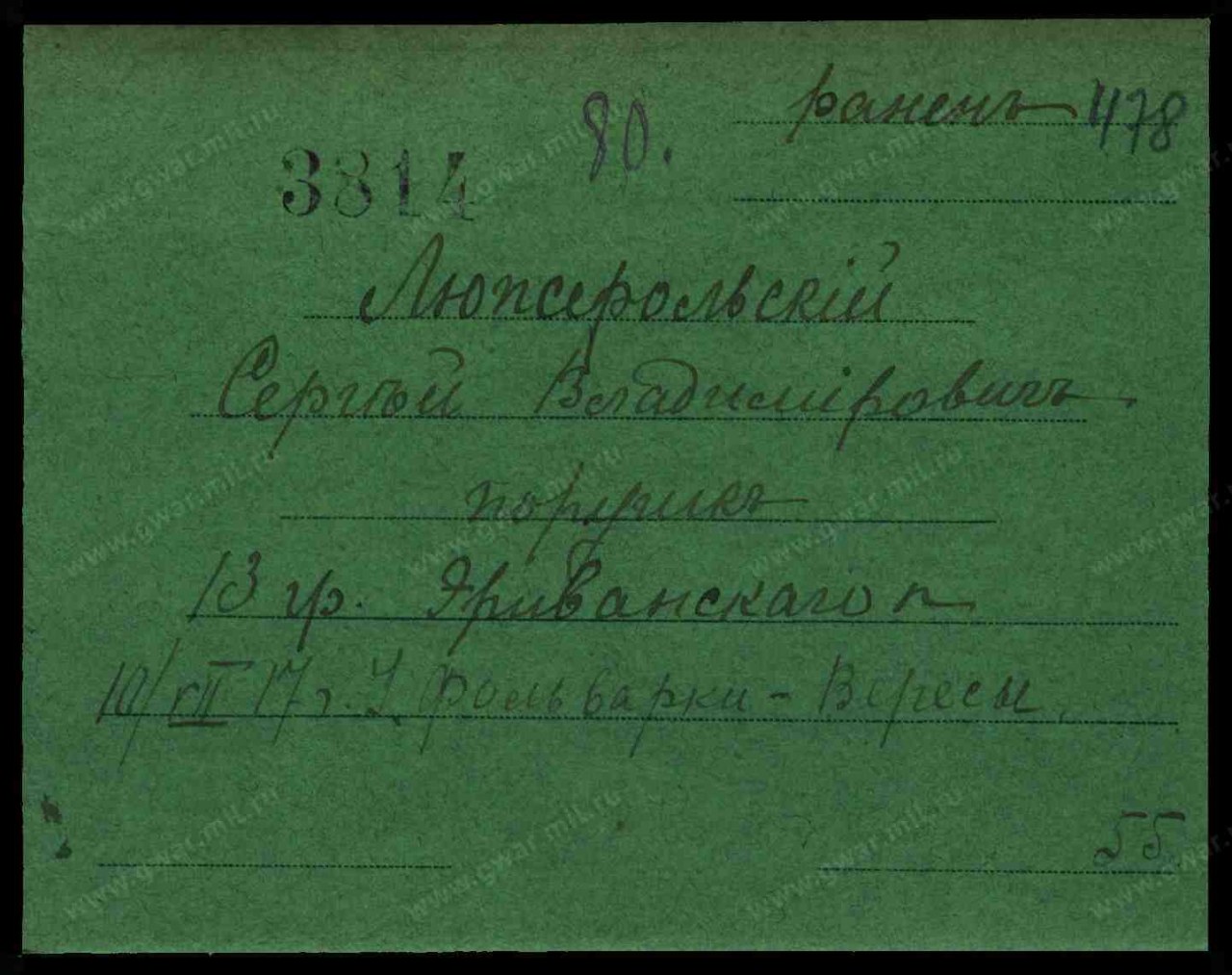 | участие в Первой Мировой войне | 1914 - 1918 | Должность/Звание лейб-гвардии прапорщик Воинская часть 13-й лейб-гренадерский Эриванский Царя Михаила Феодоровича полк Место рождения Вятская губ., Малмыжский уезд, починок Рожки Причина выбытия болен Дата события 16.06.1916 Тип документа Уведомление о приеме раненого Архив Российский Государственный Военно-исторический архив Фонд Картотека бюро учета потерь в Первой мировой войне (офицеров и солдат) Шкаф без номера Ящик 2012-Л Должность/Звание поручик лейб-гвардии Воинская часть 13-й лейб-гренадерский Эриванский полк Причина выбытия ранен/контужен Дата выбытия 10.07.1917 Место события фольварк Вересы Тип документа Карточка на прибывших (высшие чины) Архив Российский Государственный Военно-исторический архив Фонд Картотека бюро учета потерь в Первой мировой войне (офицеров и солдат) Шкаф без номера Ящик 7484-Л Должность/Звание поручик Воинская часть 13-й лейб-гренадерский Эриванский полк Причина выбытия ранен/контужен Дата выбытия 10.07.1917 Дата события 16.07.1917 Место события фольварк Вересы Тип документа Карточка на прибывших (высшие чины) Архив Российский Государственный Военно-исторический архив Фонд Картотека бюро учета потерь в Первой мировой войне (офицеров и солдат) Шкаф без номера | |