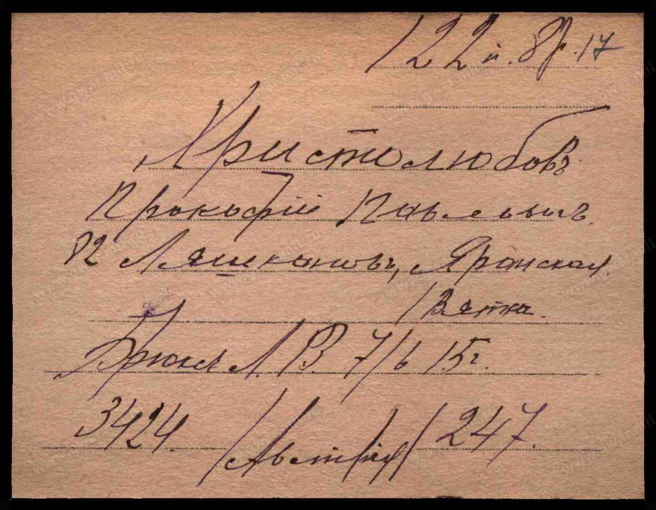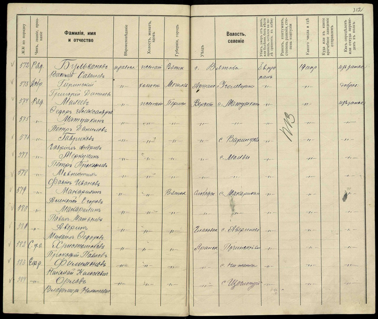 | участие в Первой Мировой войне | 1914 - 1918 | Должность/Звание ст. унтер-офицер Воинская часть 122-й пехотный Тамбовский полк Место рождения Вятская губ., Яранский уезд, Пачинская вол., с. Ляжканур Причина выбытия ранен/контужен Место выбытия с. Мощанице Дата события 23.12.1914 Тип документа Именные списки потерь Архив Российский Государственный Военно-исторический архив Фонд №16196, Особое делопроизводство по сбору и регистрации сведений о выбывших за смертью или за ранами, а также пропавших без вести воинских чинах, действующих против неприятельских армий (1914 - 1918) Опись №1, Именные списки потерь солдат и офицеров 1 мировой войны 1914-1918 гг. (по полкам и бригадам) Дело №252, Списки потерь солдат 122 пехотного Тамбовского полка Документ №39935, Список воинских чинов 122 пехотного Тамбовского полка, убитых, пропавших без вести и взятых в плен неприятелем, а также раненых и контуженных, с 10 ноября 1914 г. по 1 января 1915 г., Автор: 122-й пехотный Тамбовский полк Должность/Звание ст. унтер-офицер Воинская часть 122-й пехотный Тамбовский полк Место рождения Вятская губ., Яранский уезд, Починская вол. Причина выбытия пропал без вести Дата события 19.04.1915 Тип документа Именные списки потерь Архив Российский Государственный Военно-исторический архив Фонд №16196, Особое делопроизводство по сбору и регистрации сведений о выбывших за смертью или за ранами, а также пропавших без вести воинских чинах, действующих против неприятельских армий (1914 - 1918) Опись №1, Именные списки потерь солдат и офицеров 1 мировой войны 1914-1918 гг. (по полкам и бригадам) Дело №252, Списки потерь солдат 122 пехотного Тамбовского полка Документ №4988, Список воинских чинов 122 пехотного Тамбовского полка, убитых, пропавших без вести и взятых в плен неприятелем, а также раненых и контуженных, с 1 апреля по 1 мая 1915 г., Автор: 122-й пехотный Тамбовский полк, 1915-11-03 Дата рождения 1882 Воинская часть 122-й пехотный Тамбовский полк Лагерь лагерь военнопленных, Австро-Венгрия, Брюкс Дата водворения в лагерь 07.06.1915 Тип документа Карточки военнопленных Архив Российский Государственный Военно-исторический архив Фонд Картотека бюро учета потерь в Первой мировой войне (пленные) Шкаф без номера Ящик 6028-Х |