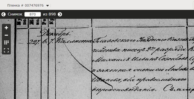 "№ 227, 6 декабря 1858 г., родилась дочь - Каллиста, родители: Глазовскаго Уезднаго Казначейства писец 2-го разряда Михаил Ильин Созонтов и законная жена его Любовь Иванова, оба православнаго вероисповедания"