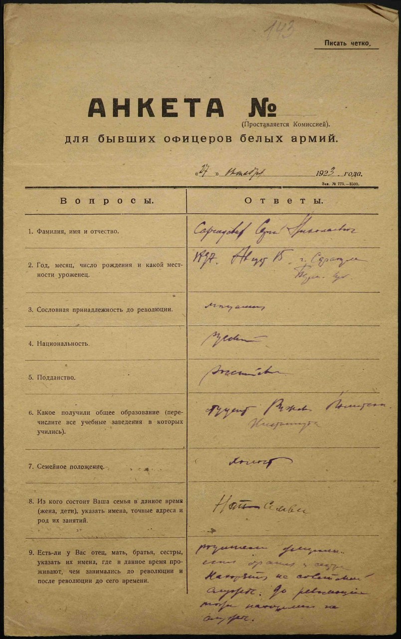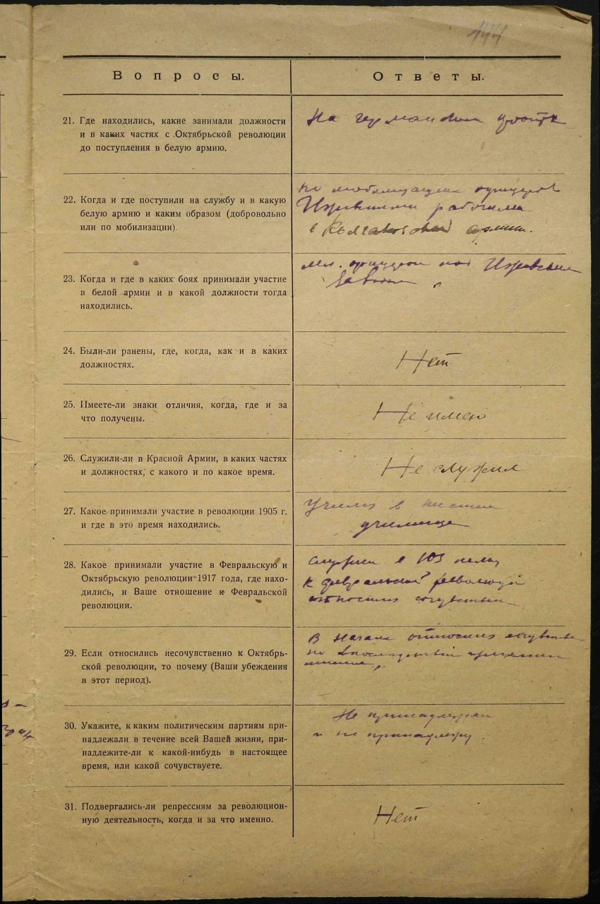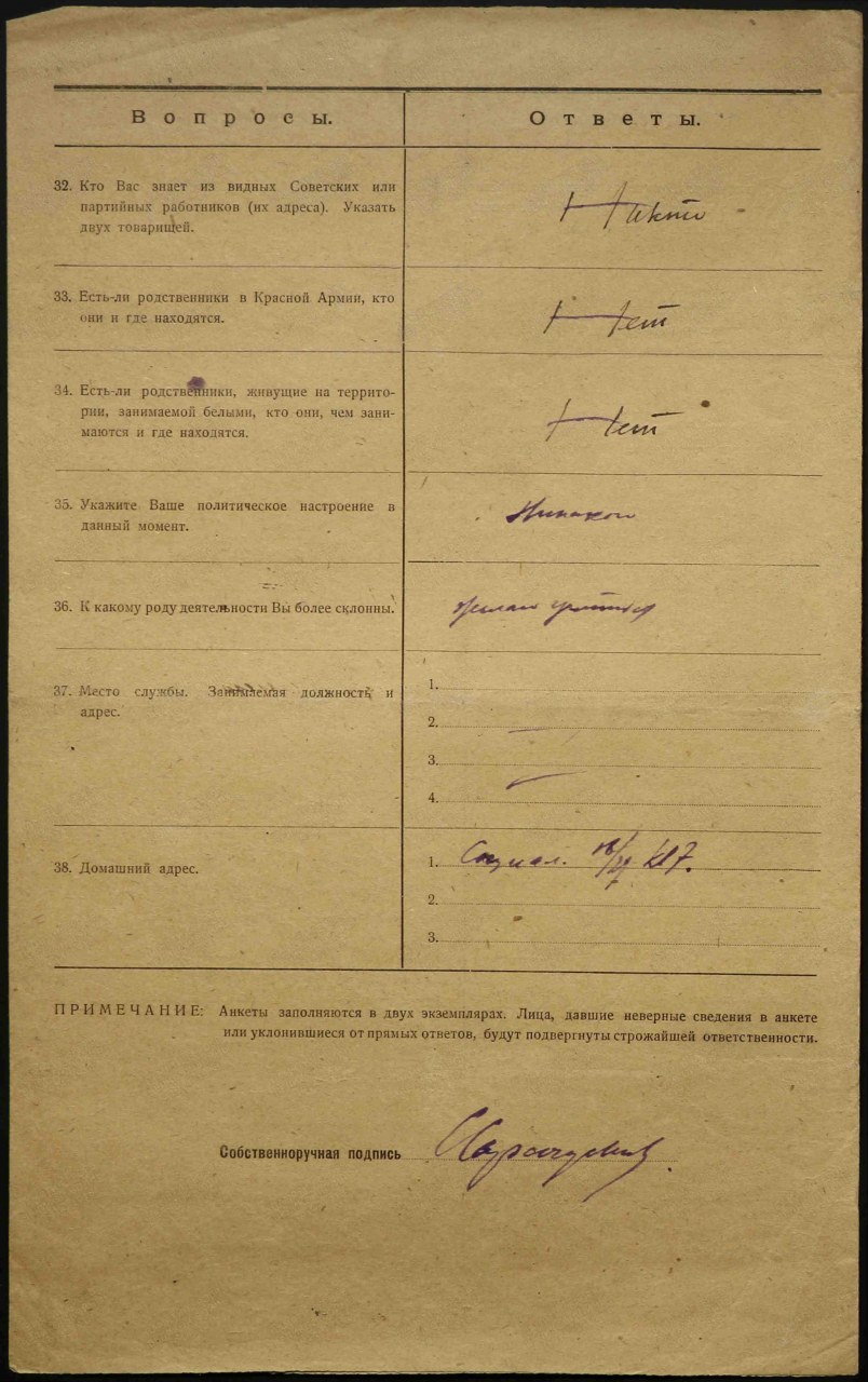 Анкета для бывших офицеров белых армий