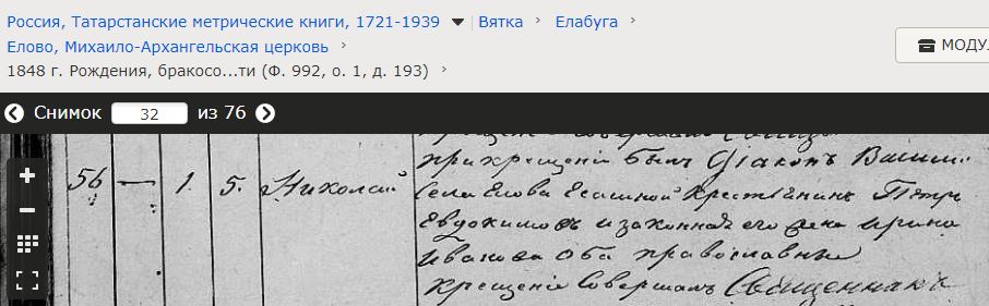 "№ 56, 1 декабря 1848 г., родился сын - Николай, родители: Села Елова ясашной крестьянин Петр Евдокимов и законная его жена Ирина Иванова оба православные"