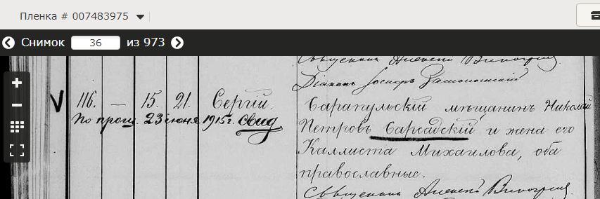 Родители: Сарапульский мещанин Николай Петров Сарсадский и жена его Каллиста Михайлова, оба православные