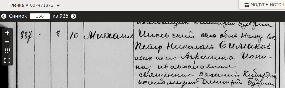 Родители: Ижевский сельский обыватель Нагорской волости Петр Николаев Симаков и законная жена его Агрипина Ионина, православные