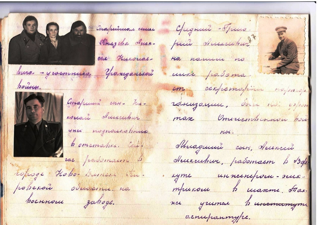 | Родился ребёнок: Николай Алексеевич Князев | 24.12.1918 | деревня Красная Слудка (Мурашинский район, Кировская область) - ныне не существует | Участник ВОв. орден "Красной Звезды", медаль "За победу над Германией". Военный. Подполковник. Проживал в г. Нововятске Кировской области. |